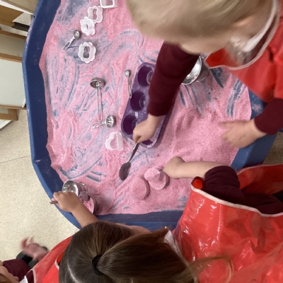 The children played with pink sand. They used silicone cupcake moulds, birthday candles, and measuring spoons to create their own pretend cakes.