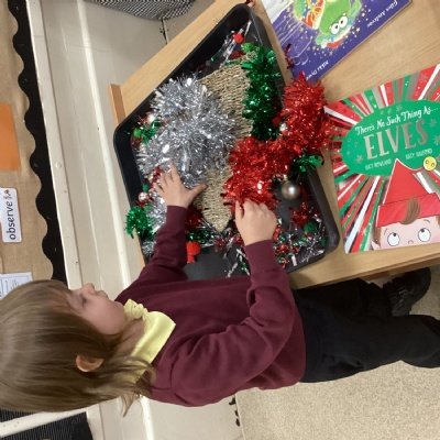 The children explored Christmas-themed objects such as tinsel, baubles, Christmas cards, and gift wrap bows. They examined textures, colours and shapes.
