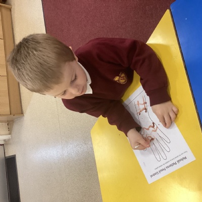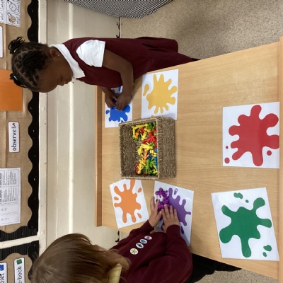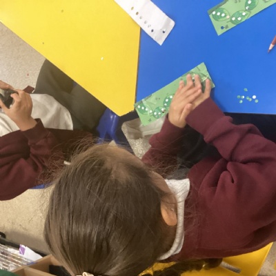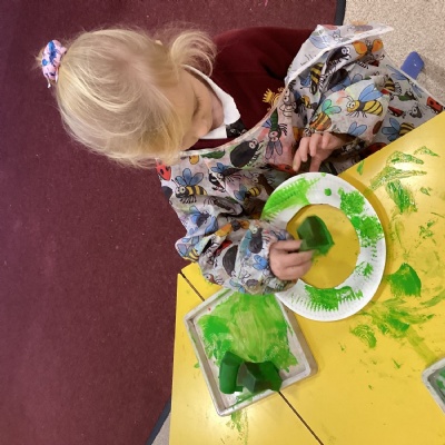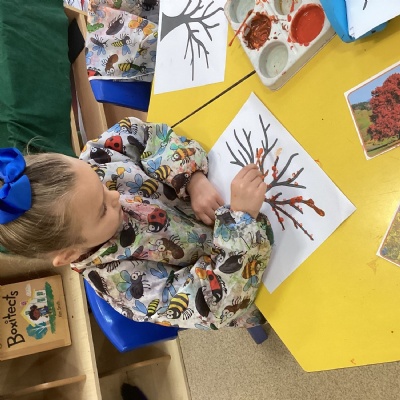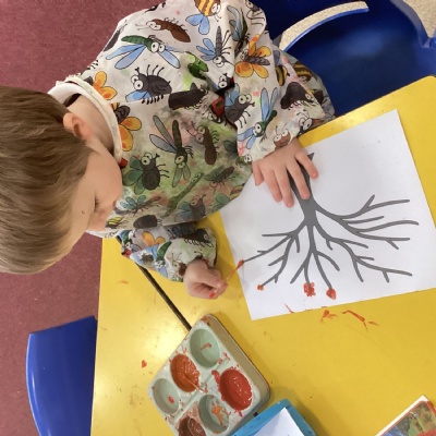 The children engaged in a range of Autumn-themed creative activities. Using cotton buds and paint, they created Autumn tree silhouettes by adding colourful leaves to the trunks and branches. They also enjoyed conker painting, rolling conkers through trays of paint to produce fun, patterned prints.