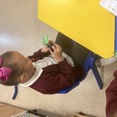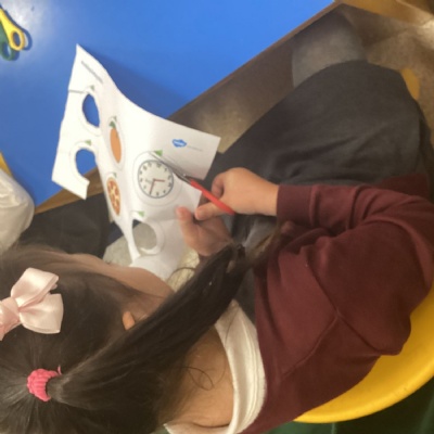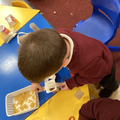 The children explored a range of creative tools, including scissors, glue sticks, hole punches, and cello tape. They were encouraged to use them independently, building confidence and developing their fine motor skills through cutting, sticking, and joining materials.