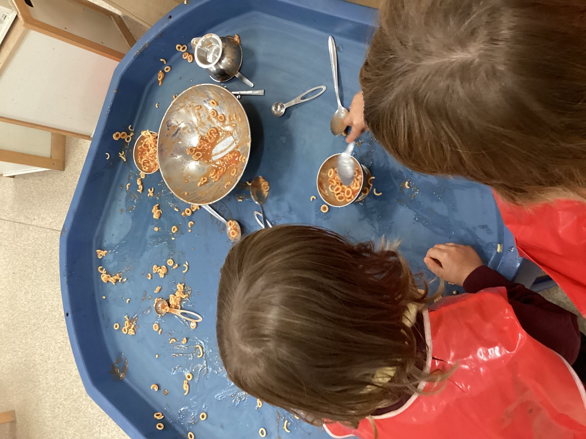 The children explored tinned foods using different sized spoons, scoops, and bowls. They enjoyed the sensory experience of feeling and moving the different textures.