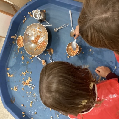 The children explored cereals as “reindeer food,” using different sized spoons, scoops and bowls to fill, pour, and mix.
