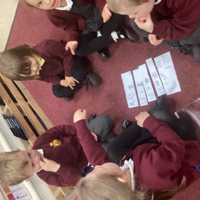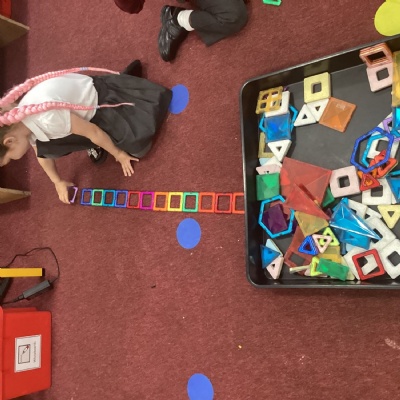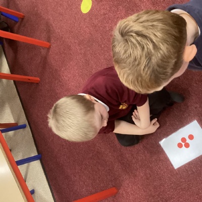 When exploring shapes made by Numberblock Four, children began to develop conceptual subitising, noticing subgroups within 4 (for example, 2 and 2 or 3 and 1). We then used this understanding to create our own patterns of 4.