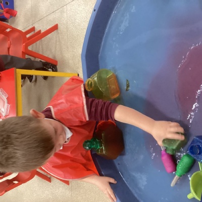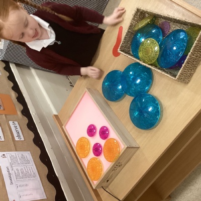 The children explored a colour-changing light box. They experimented with how different materials and colours interacted with the light, observing changes and making predictions.