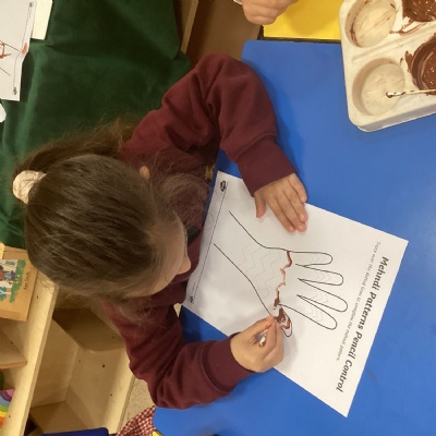 Throughout the week, the children explored Diwali through books and video clips, discovering how people prepare for and celebrate this festival. They explored items and photographs associated with Diwali, such as diva lamps, candles, patterned fabrics, saris, Mehndi designs, and Rangoli patterns.