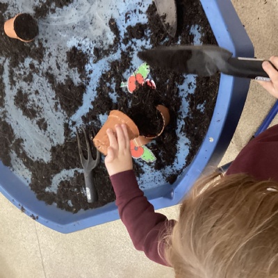 The children created their own “poppy field” using mud, artificial poppies, shovels and plant pots. They enjoyed digging, filling and planting.