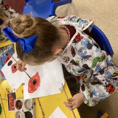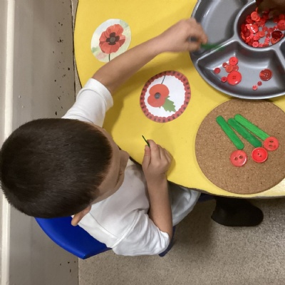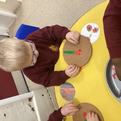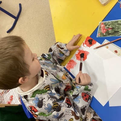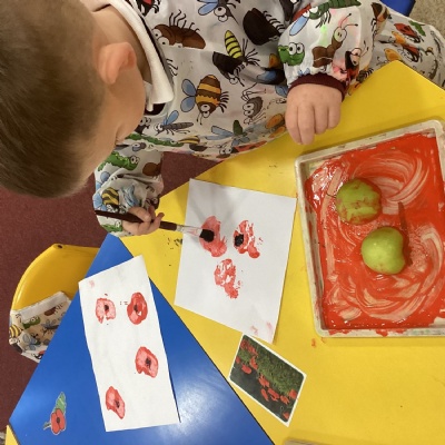 The children explored poppies through a variety of creative activities. They began by painting red poppies, using photographs of real flowers for inspiration to create their own unique designs. Then, they experimented with poppy printing — using halved apples to stamp poppy shapes and explore different patterns and textures.