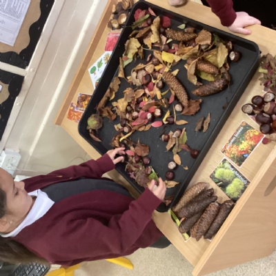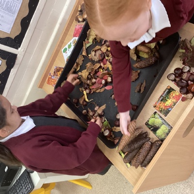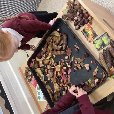 The children explored autumn objects such as leaves, pinecones, acorns, and conkers using magnifying glasses. They observed textures, shapes and colours closely.