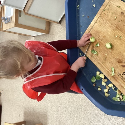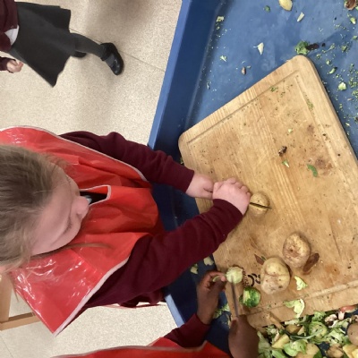 The children explored vegetables including cauliflower, potato, sprouts, carrot, and cabbage. Using knives, they chopped, handled and examined the different textures, shapes and smells.