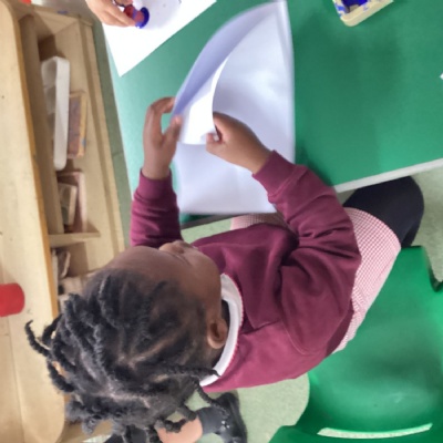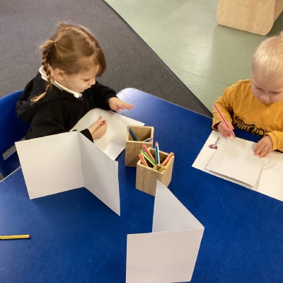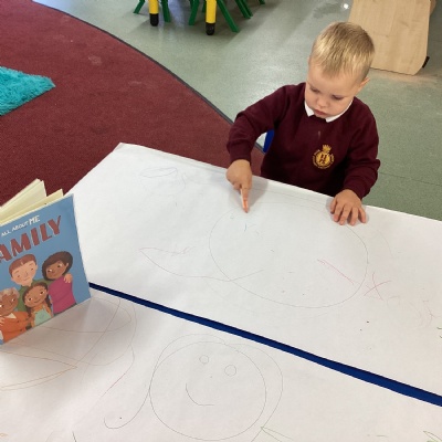 We read a book about different types of families and have been able to share information about our family with our friends. We also spent some time drawing ourselves and our family members on large sheets of paper.