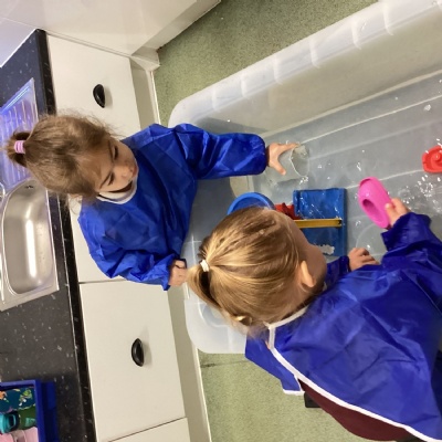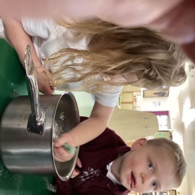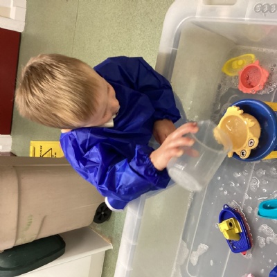 The water tray has been very popular this week, we have had fun splashing, pouring and scooping water. We also enjoyed sailing the boats and watching the water fall down the water wheel.