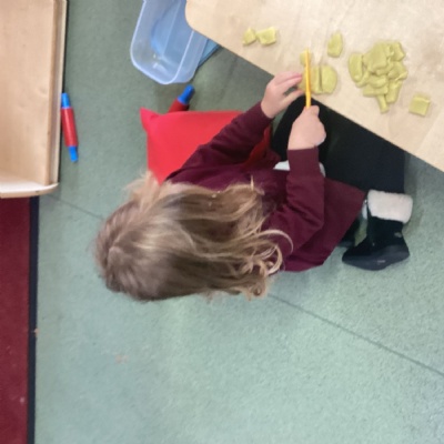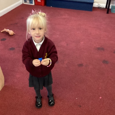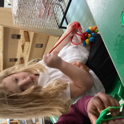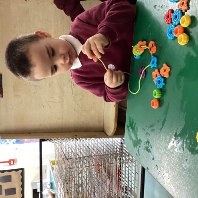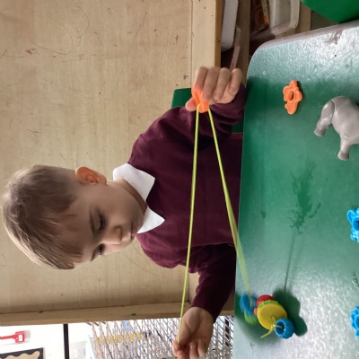 To work on our fine motor skills, this week, we have worked hard to learn how to thread beads onto pieces of string.