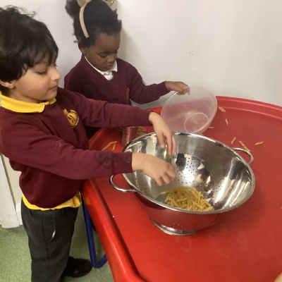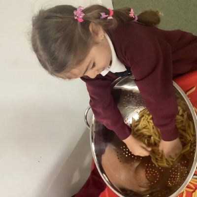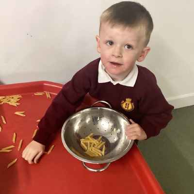 We have been learning about senses this week and the pasta in the messy tray area helped us talk about this. We could make different noises with the pasta in the various containers, and we began to talk about how the pasta felt in our hands. Some of us even said we like to eat pasta.