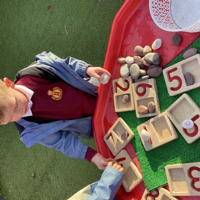 Our focus in maths this week was the number one. We looked at recognising the numeral, showing one with our fingers and identifying one of a given object (one book, one star etc). We were also able to show one using a five frame.