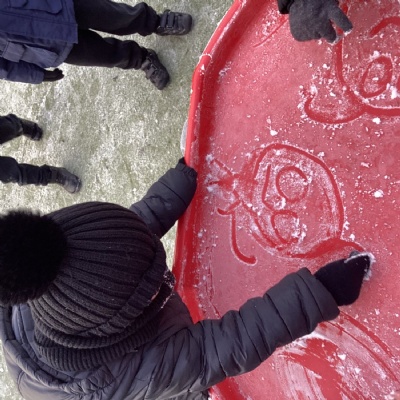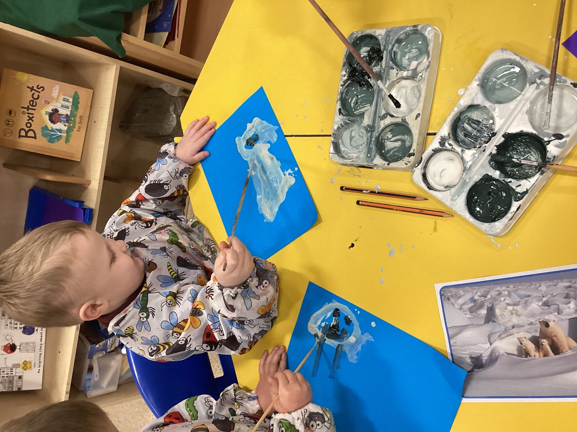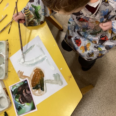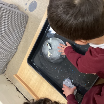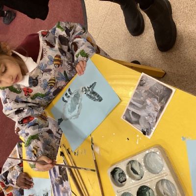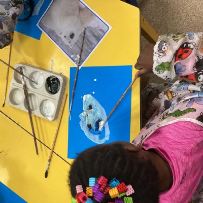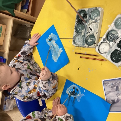 We painted Arctic animals like polar bears, wolves, and penguins. The children chose colours for a purpose and used thin brushes to add details. They also explored painting on different textures, including tin foil, enjoying experimenting with how paint looks and moves on each surface
