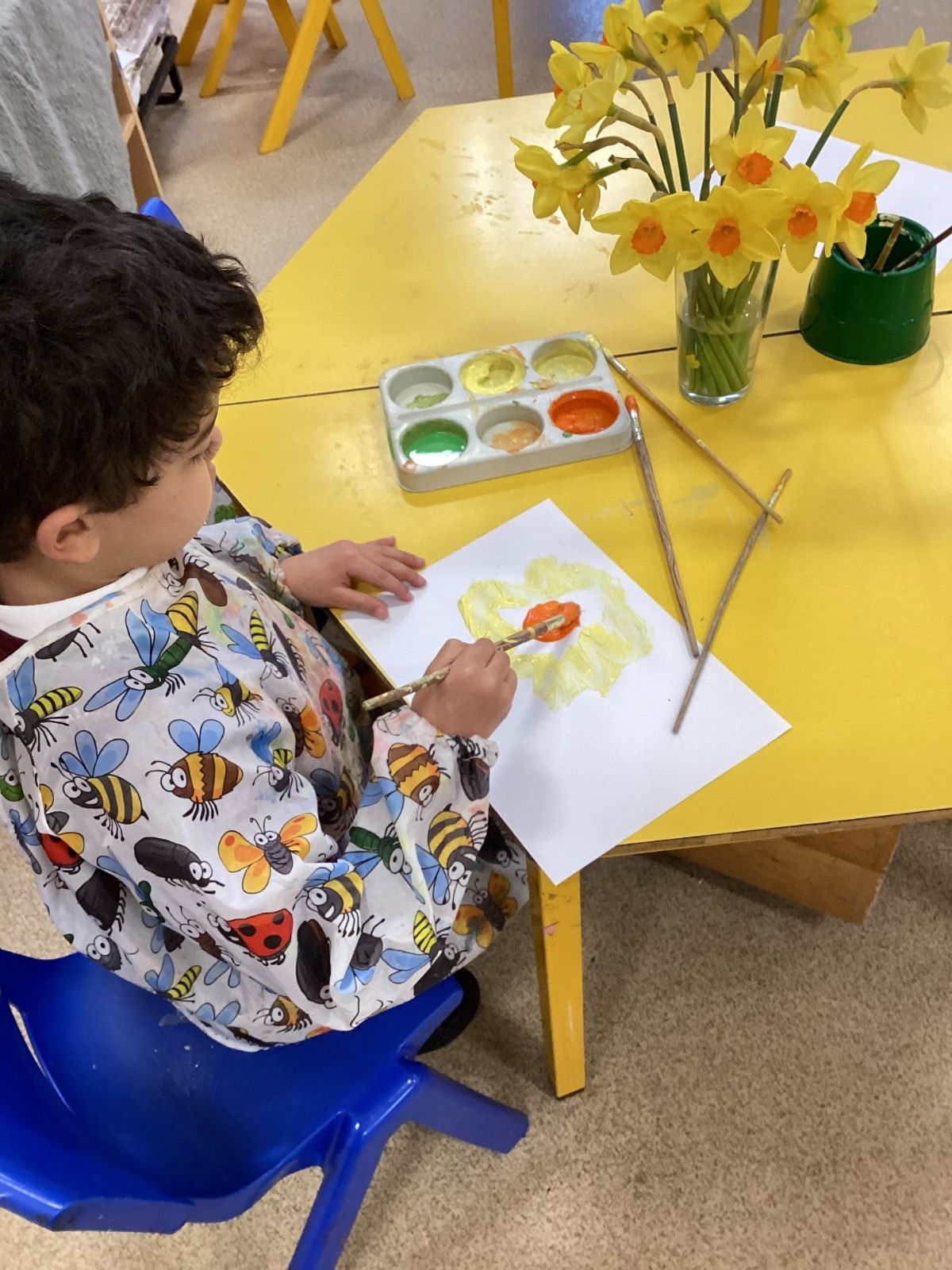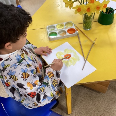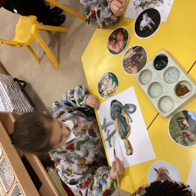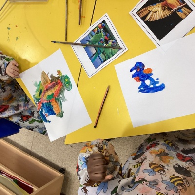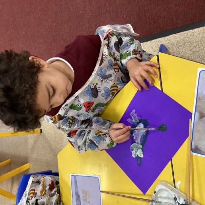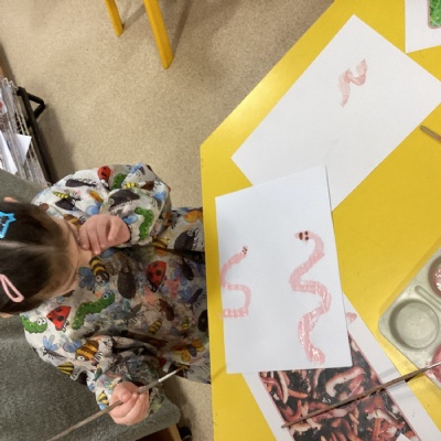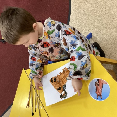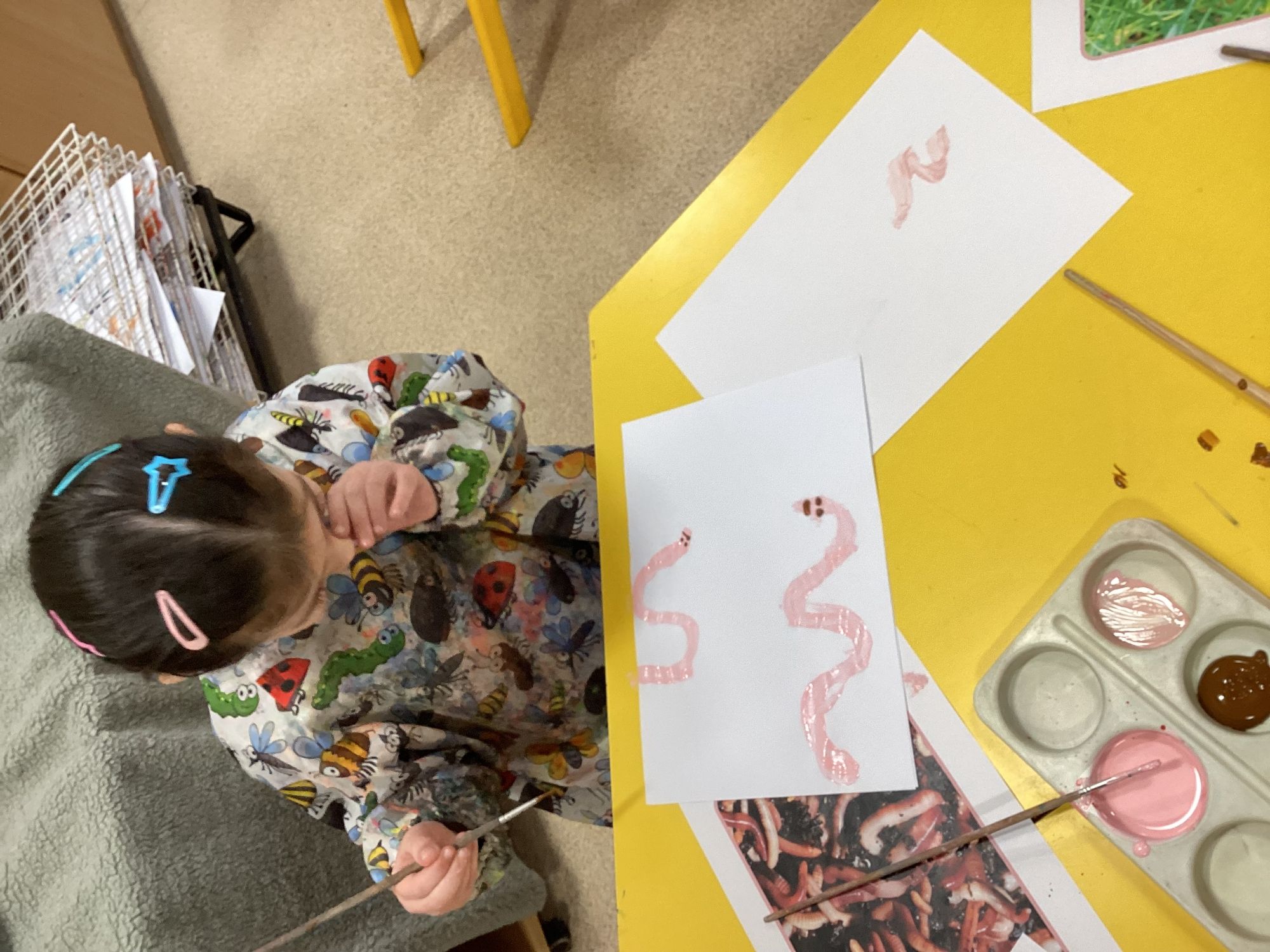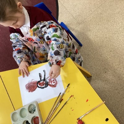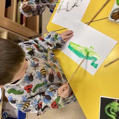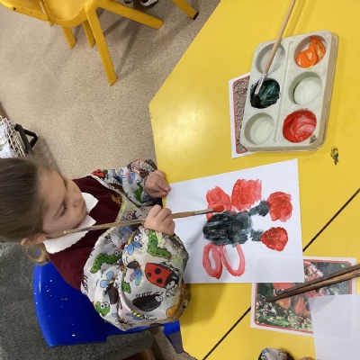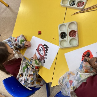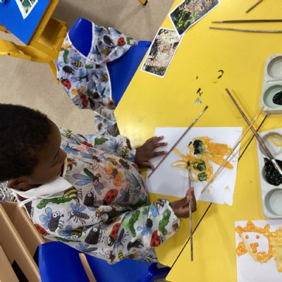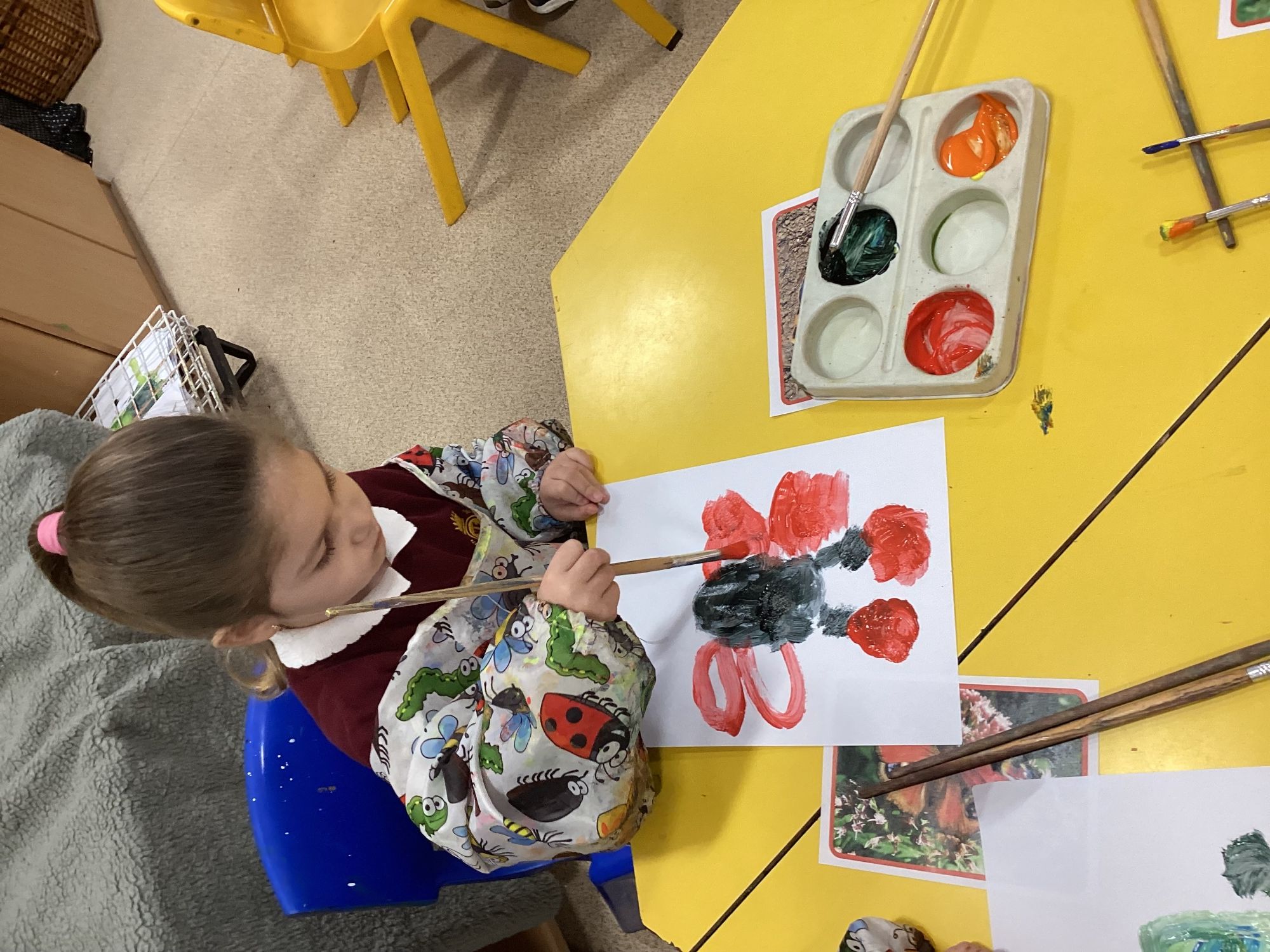 Children took part in minibeast painting, creating pictures of spiders, worms, ladybirds, butterflies and bees, and chose colours purposefully to represent the features of each minibeast.