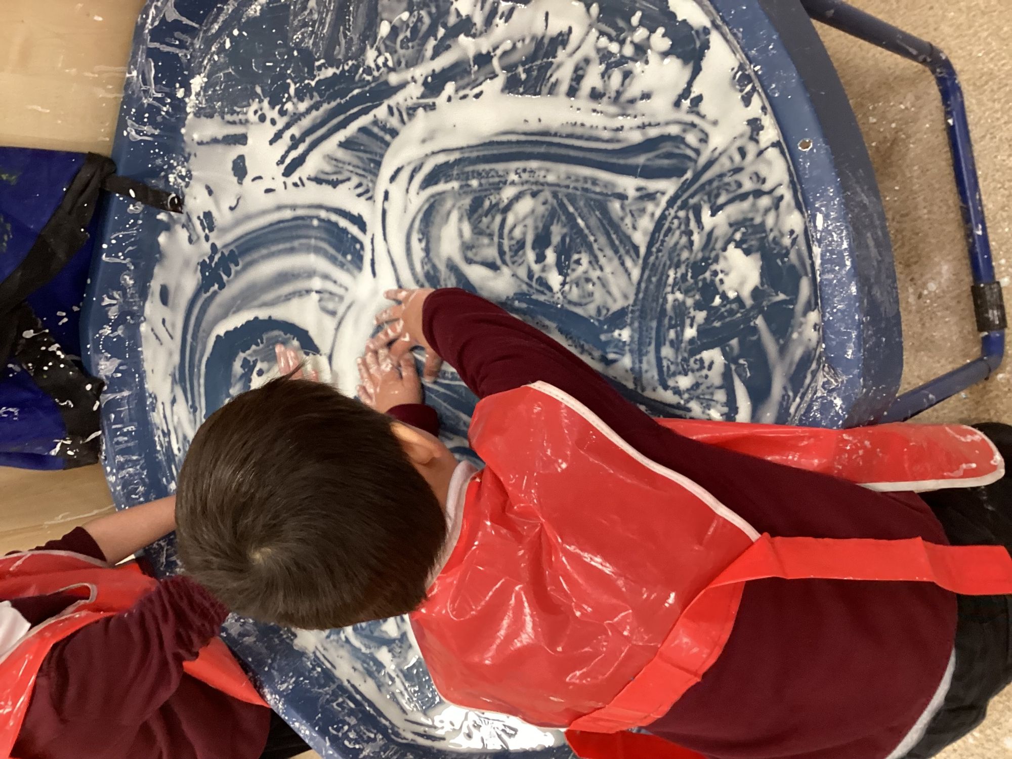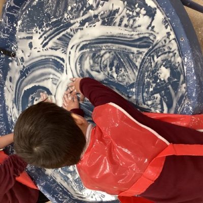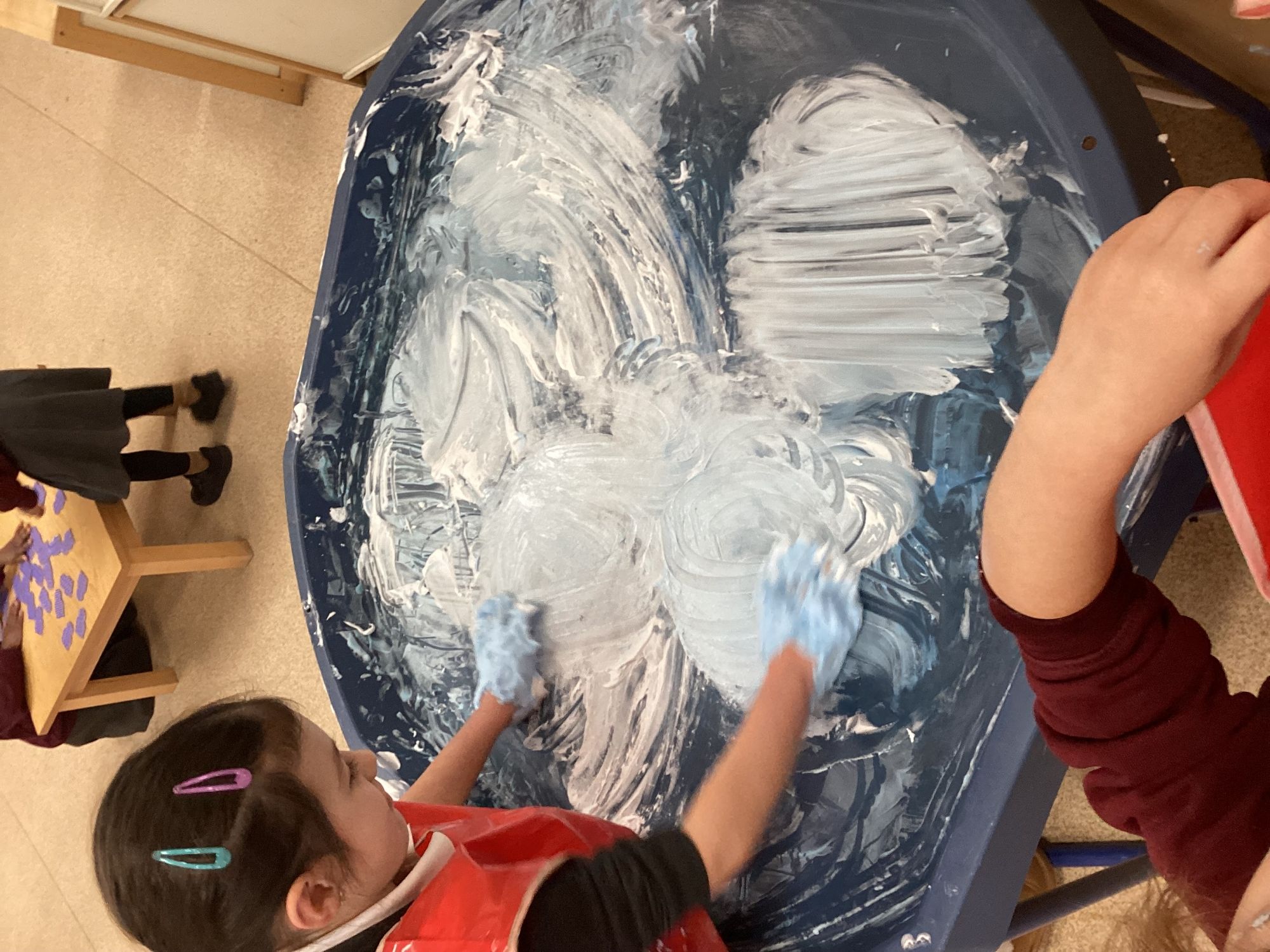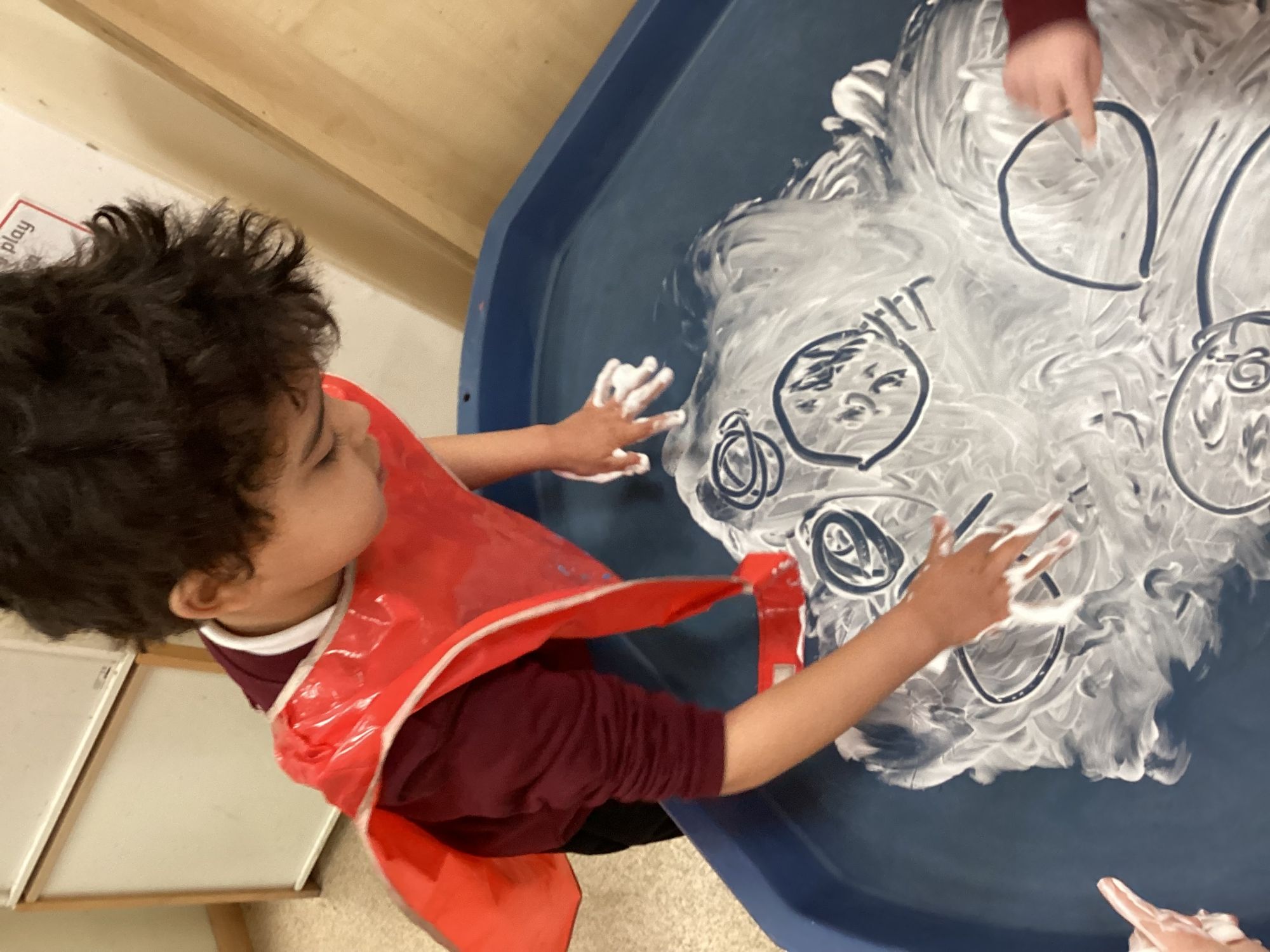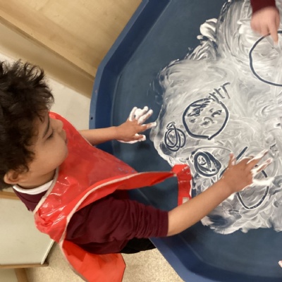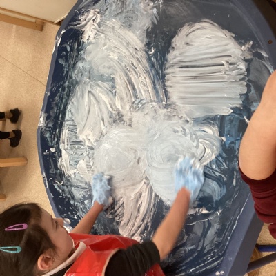 We explored shaving foam. The children used their hands to squish, spread, and pat the foam. Everyone enjoyed feeling the soft, fluffy texture and experimenting with different ways to move and play with it.