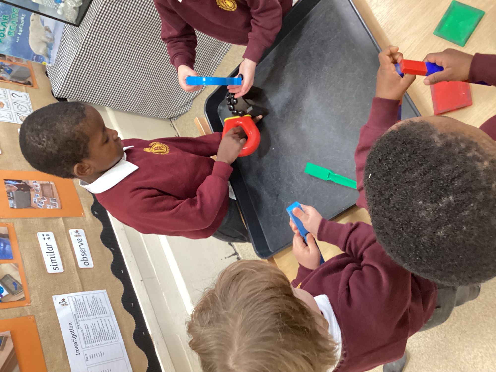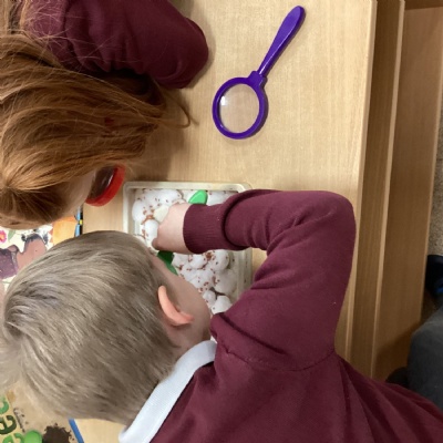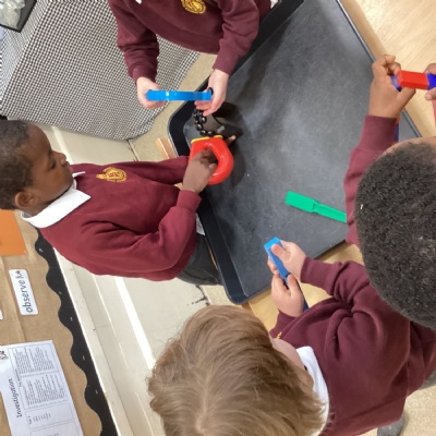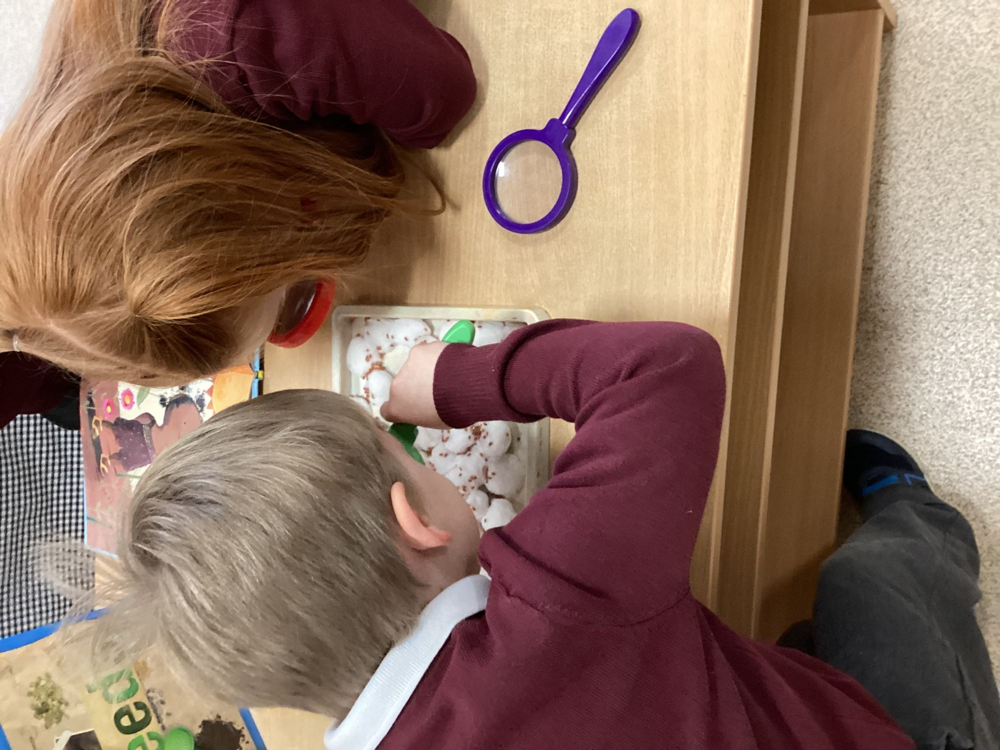 We explored magnets and how they attract objects. The children tested different materials to see which ones the magnets would stick to, moving the magnets over and under objects and discovering what was magnetic. They enjoyed experimenting and observing the “pull” of the magnets.