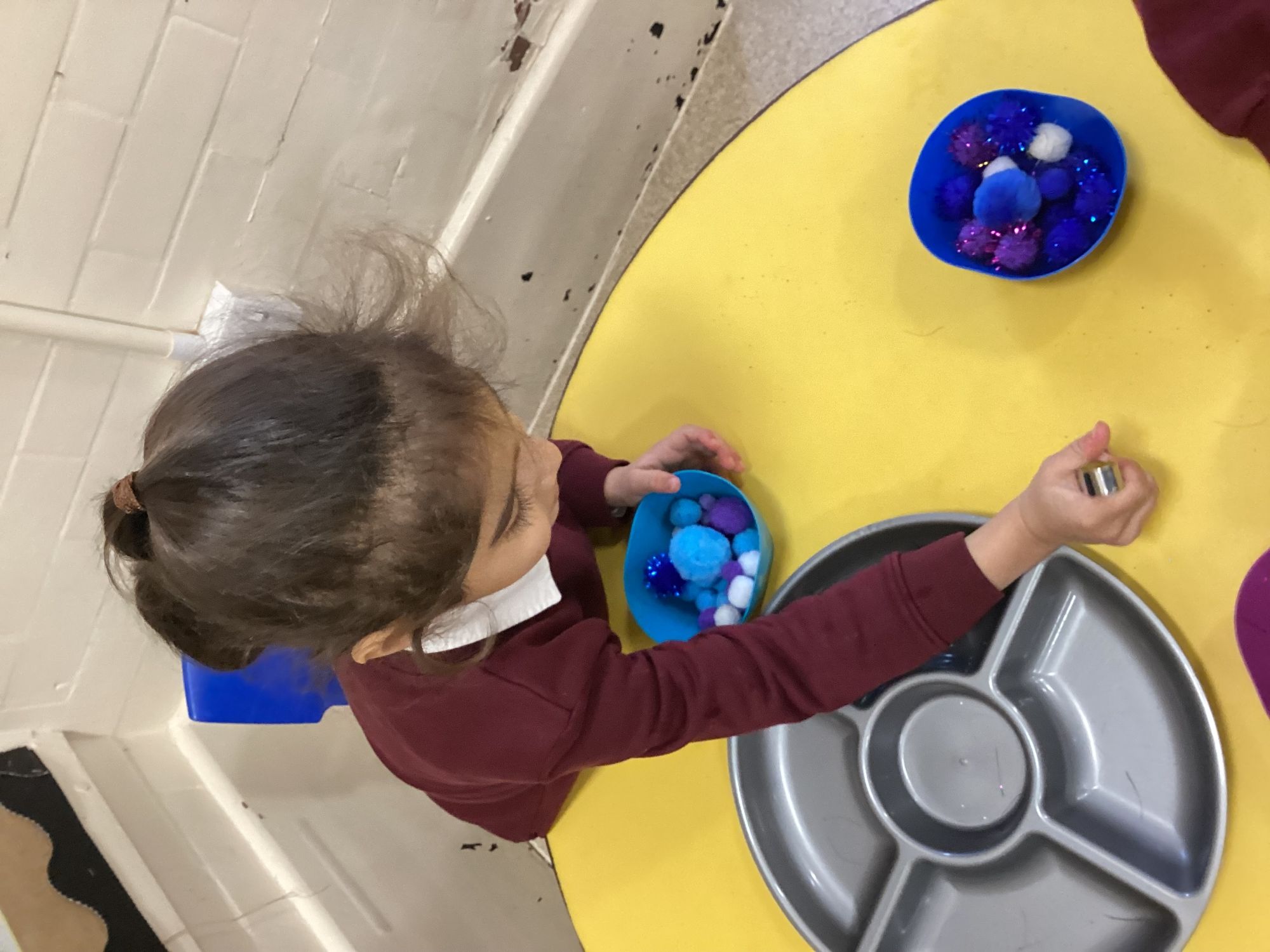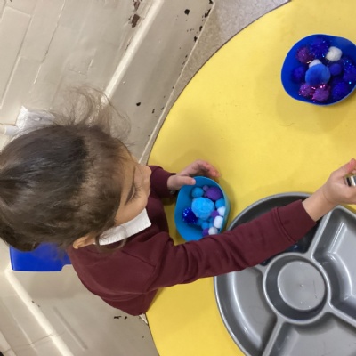 The children used tweezers to pick up purple, blue and white pom-poms and place them into containers. They practised their pincer grip and hand-eye coordination, enjoying the challenge of moving the pom-poms carefully.