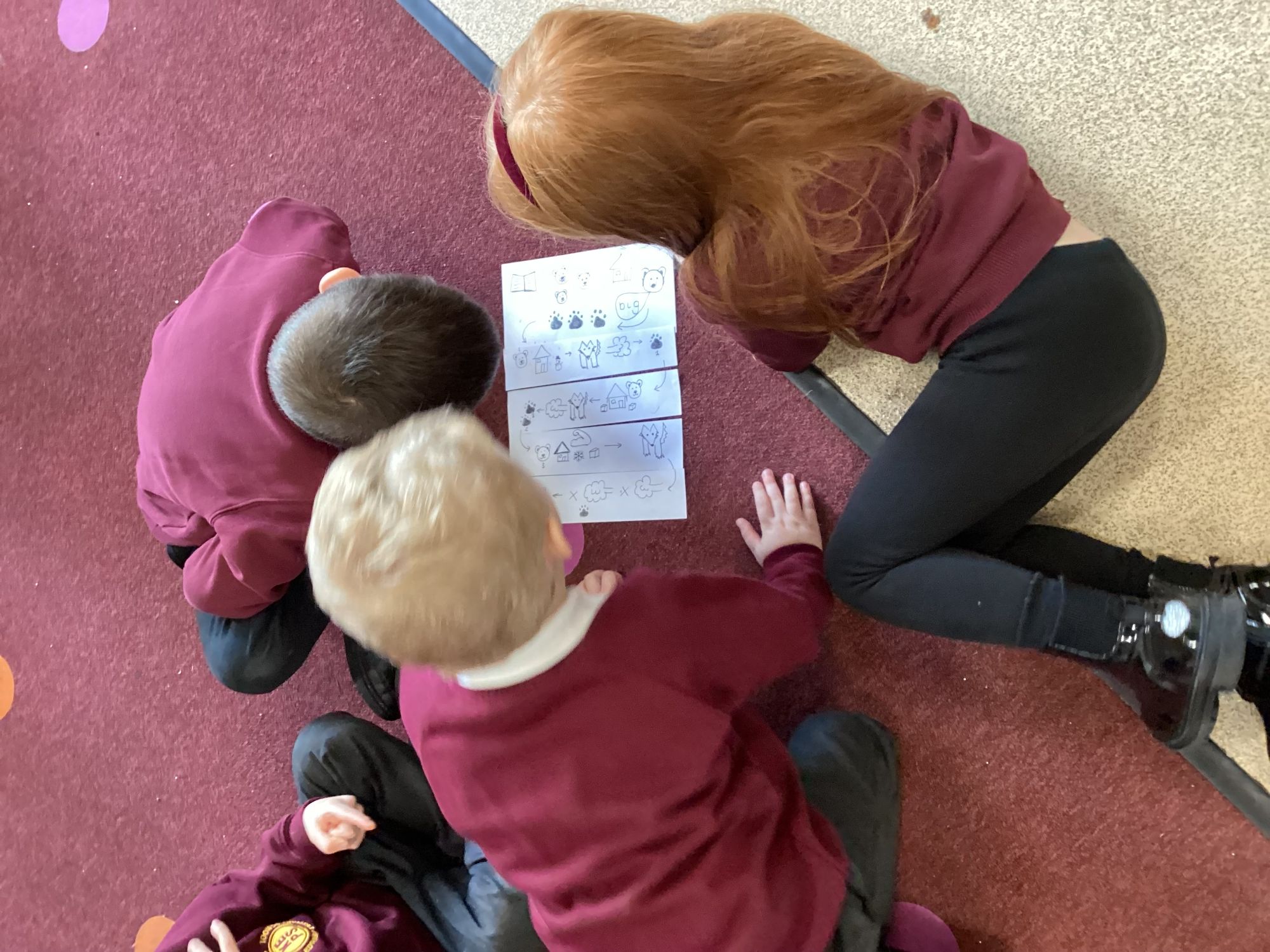 We went into the classroom to find fur, snow and some frozen polar bear food. We were very excited! After lunch, we discovered polar bear footprints. Polo has been exploring our classroom. Polo also left us a story map and needed our help—it was all cut up! We worked in small groups to sequence the story and put it in the correct order.