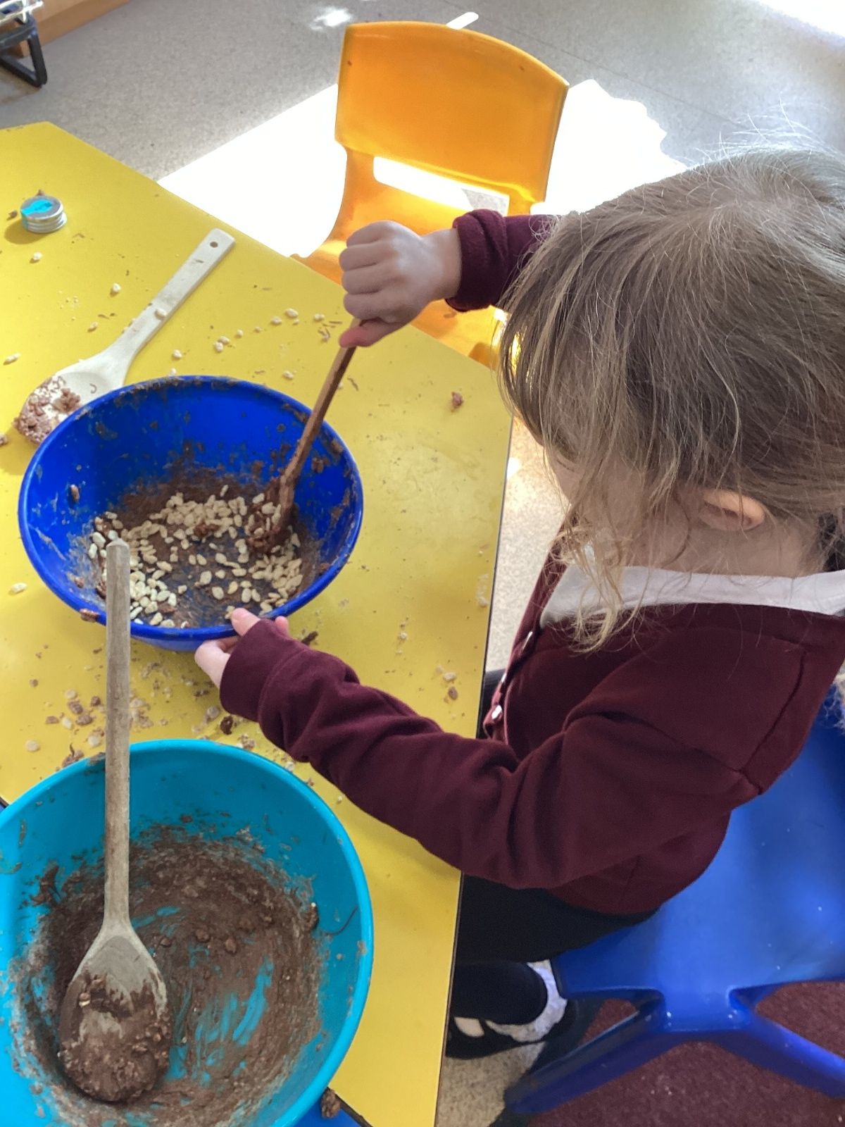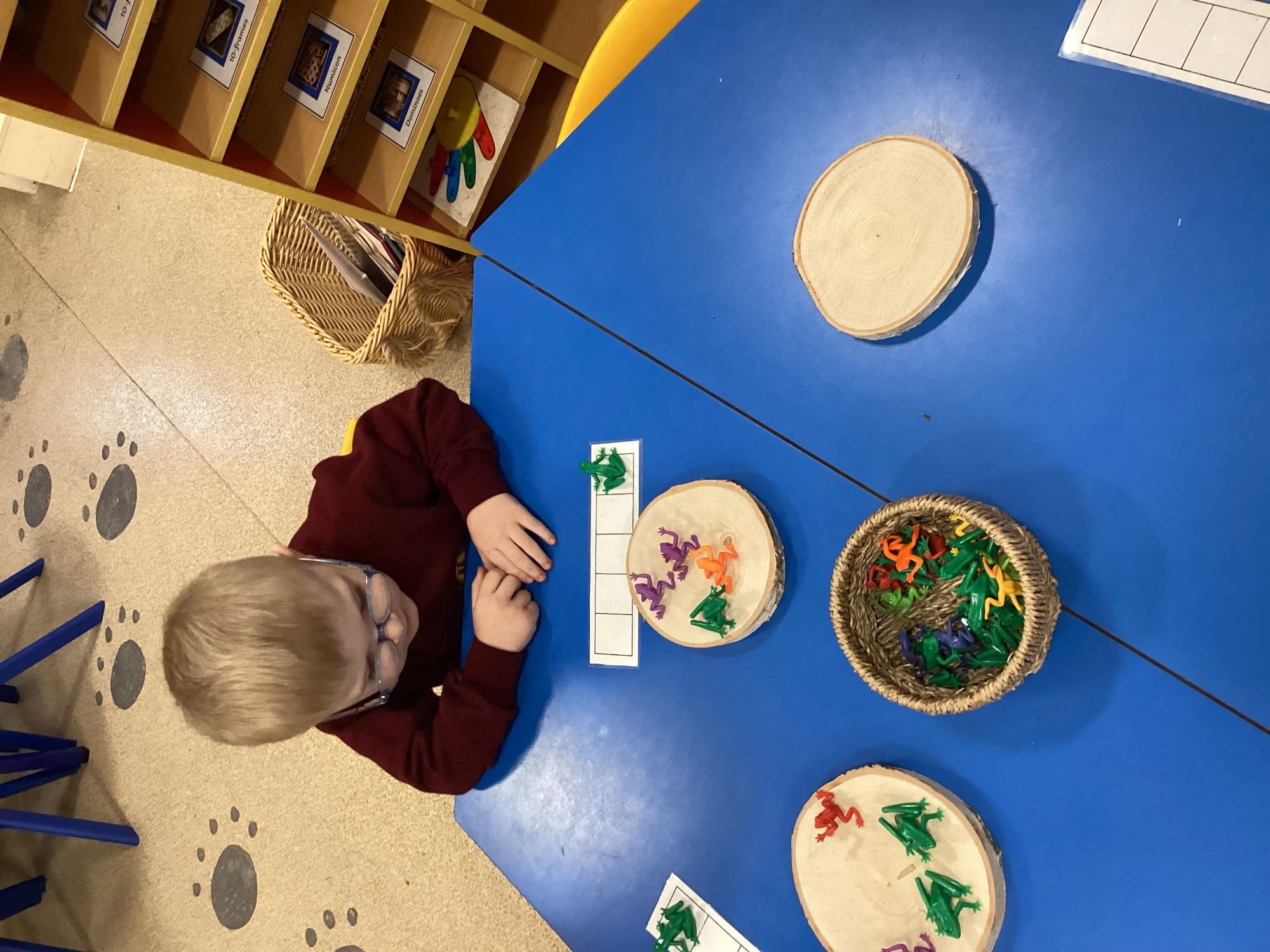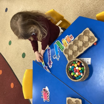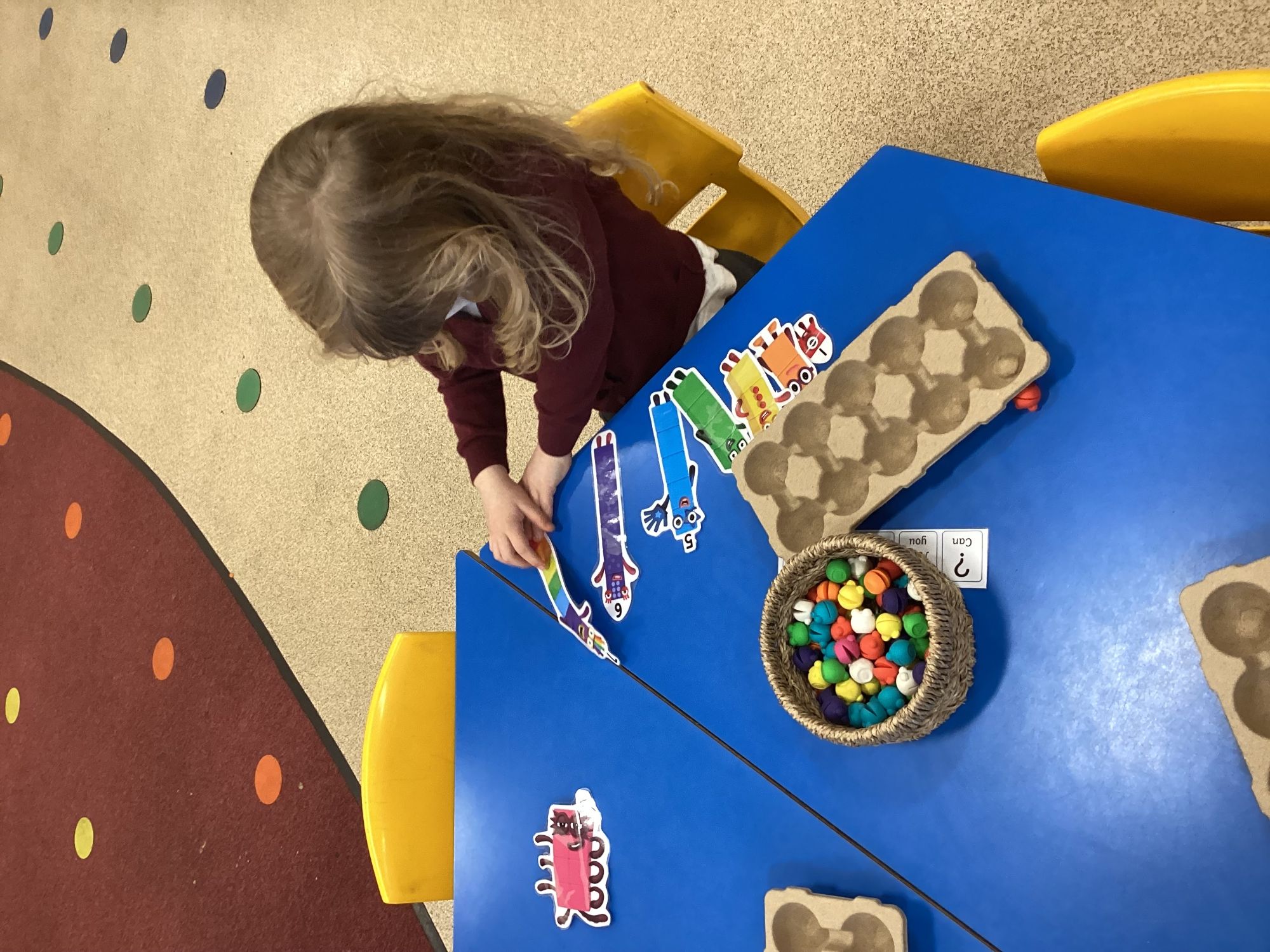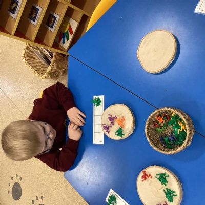 The children explored how the number 5 can be made from smaller parts. They investigated part–part–whole relationships by moving frogs from a log to a pool in a nursery rhyme, noticing how 5 can be made in different ways, such as 3 and 2. The children enjoyed seeing how a whole is made up of smaller parts and comparing different ways to make 5.