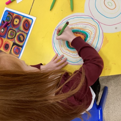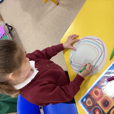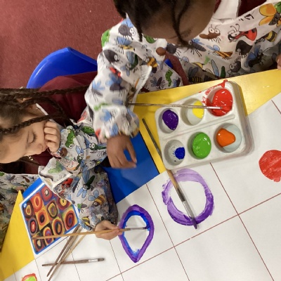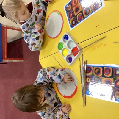 We explored circles inspired by Kandinsky. The adult prepared cut-out paper circles and squares, and divided sheets into squares. The children drew or painted circles inside the shapes, experimenting with colour, size, and placement. They enjoyed exploring patterns and expressing their creativity through this activity.