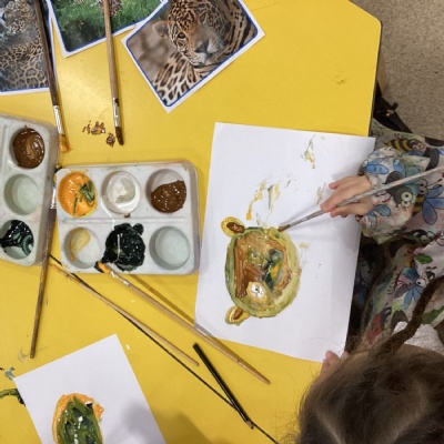 We painted rainforest animals like jaguars, monkeys, parrots, snakes, and sloths. The children chose colours for a purpose and used thin brushes to add details, enjoying experimenting with patterns, textures, and fine brushwork to bring their animals to life.