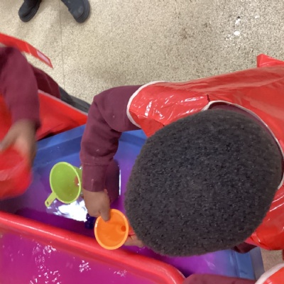 We explored water using funnels, jugs, colanders, and pipettes. The children poured, filled, and transferred water, noticing how it moved through different tools. They experimented with pouring at different speeds, watching the water flow, and enjoyed splashing and mixing.