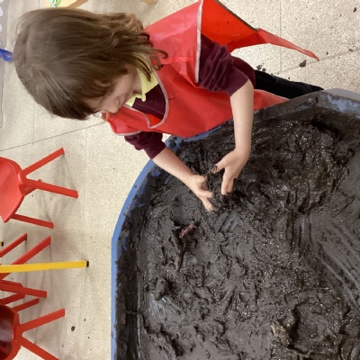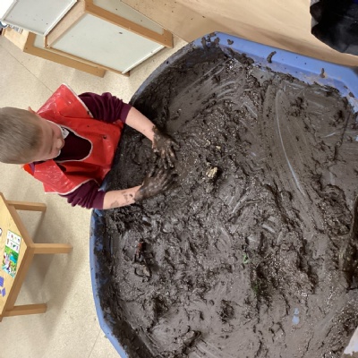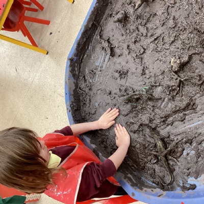 We explored the muddy swamp. The children squished, stirred, and shaped the mud, noticing how wet, sticky, and squelchy it felt. They used their hands to make patterns, dig, and create, enjoying the messy, sensory experience.