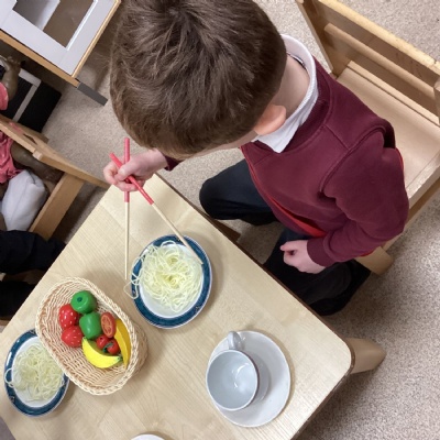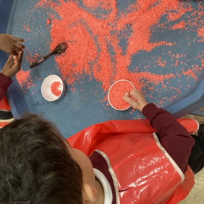 We explored red rice using chopsticks, spoons, and bowls. The children practised scooping, pouring, and transferring the rice, noticing how it moved and felt. They experimented with different tools and enjoyed the challenge of using chopsticks to pick up the grains.