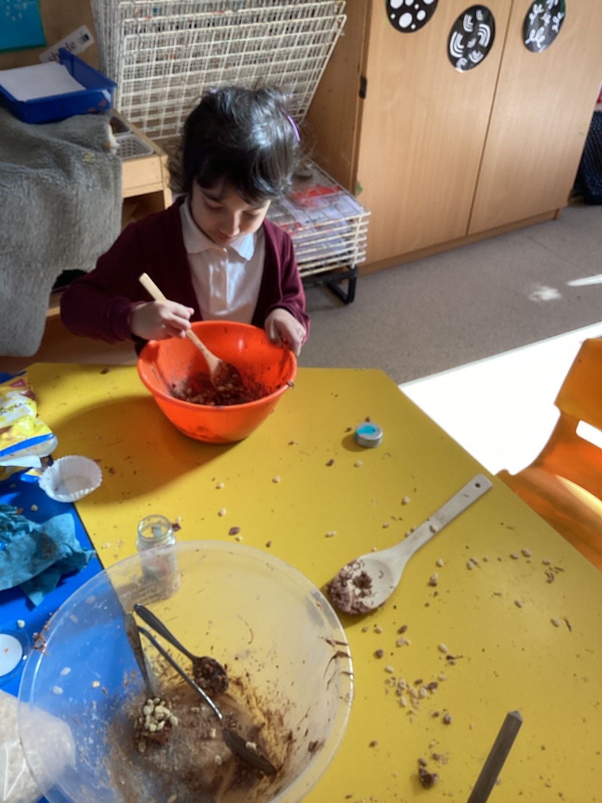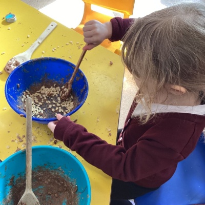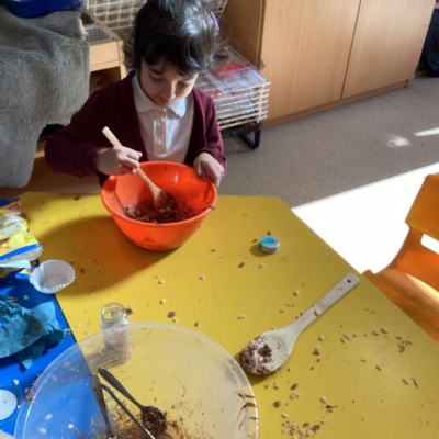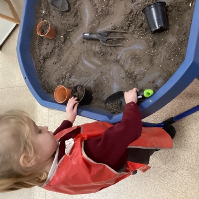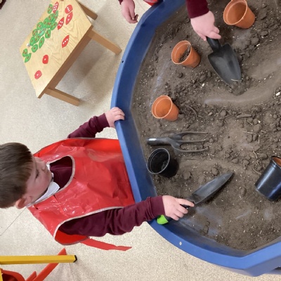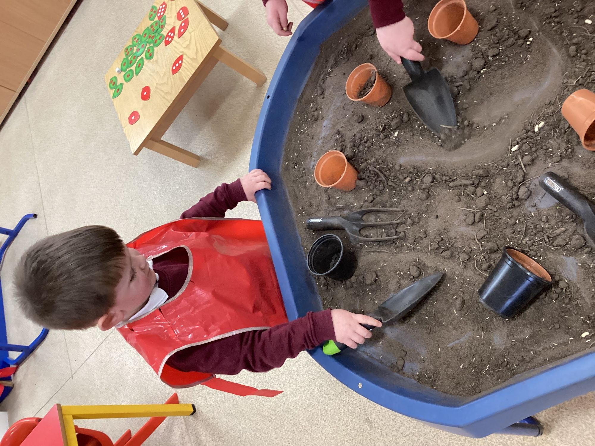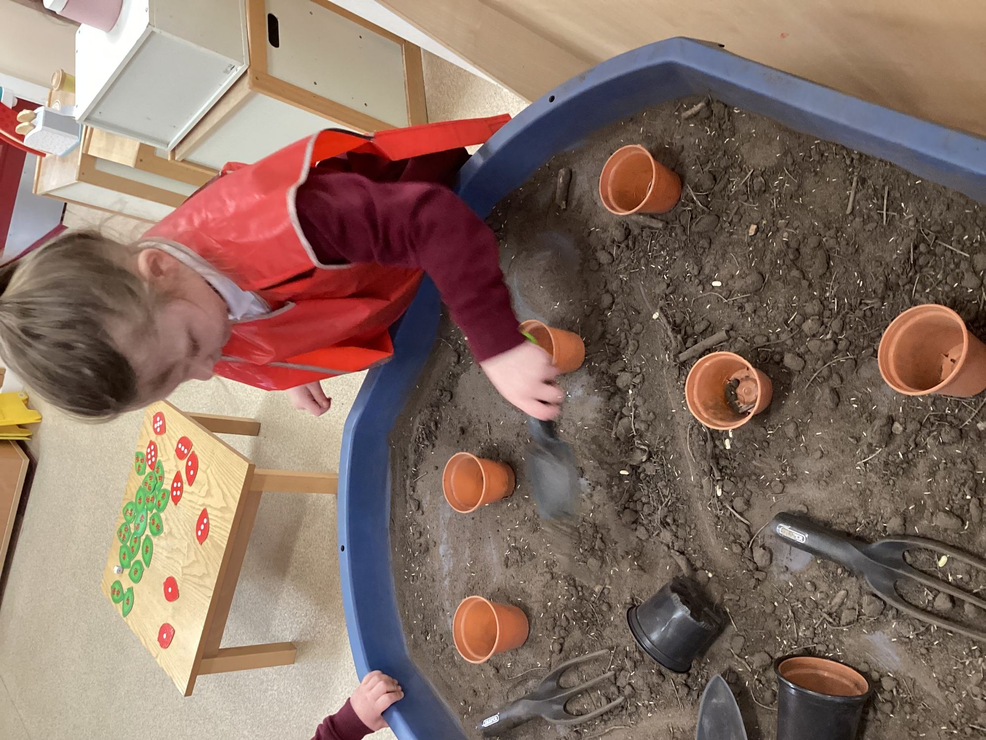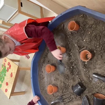 Children engaged in pretend messy play using soil, seeds, shovels and plant pots. They explored the idea of planting and caring for seeds, developing their understanding of growth and nurturing through imaginative play.