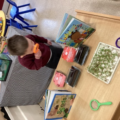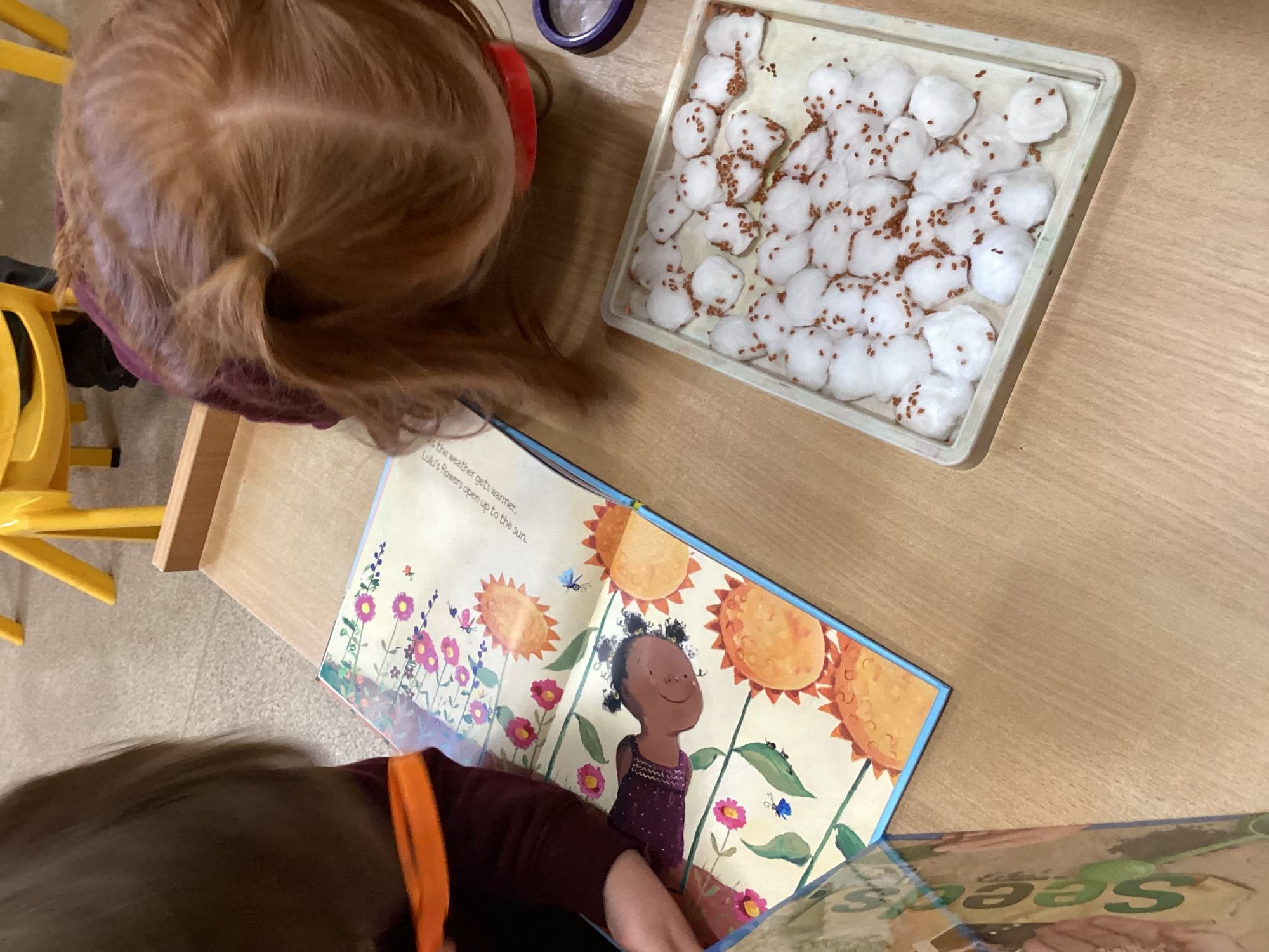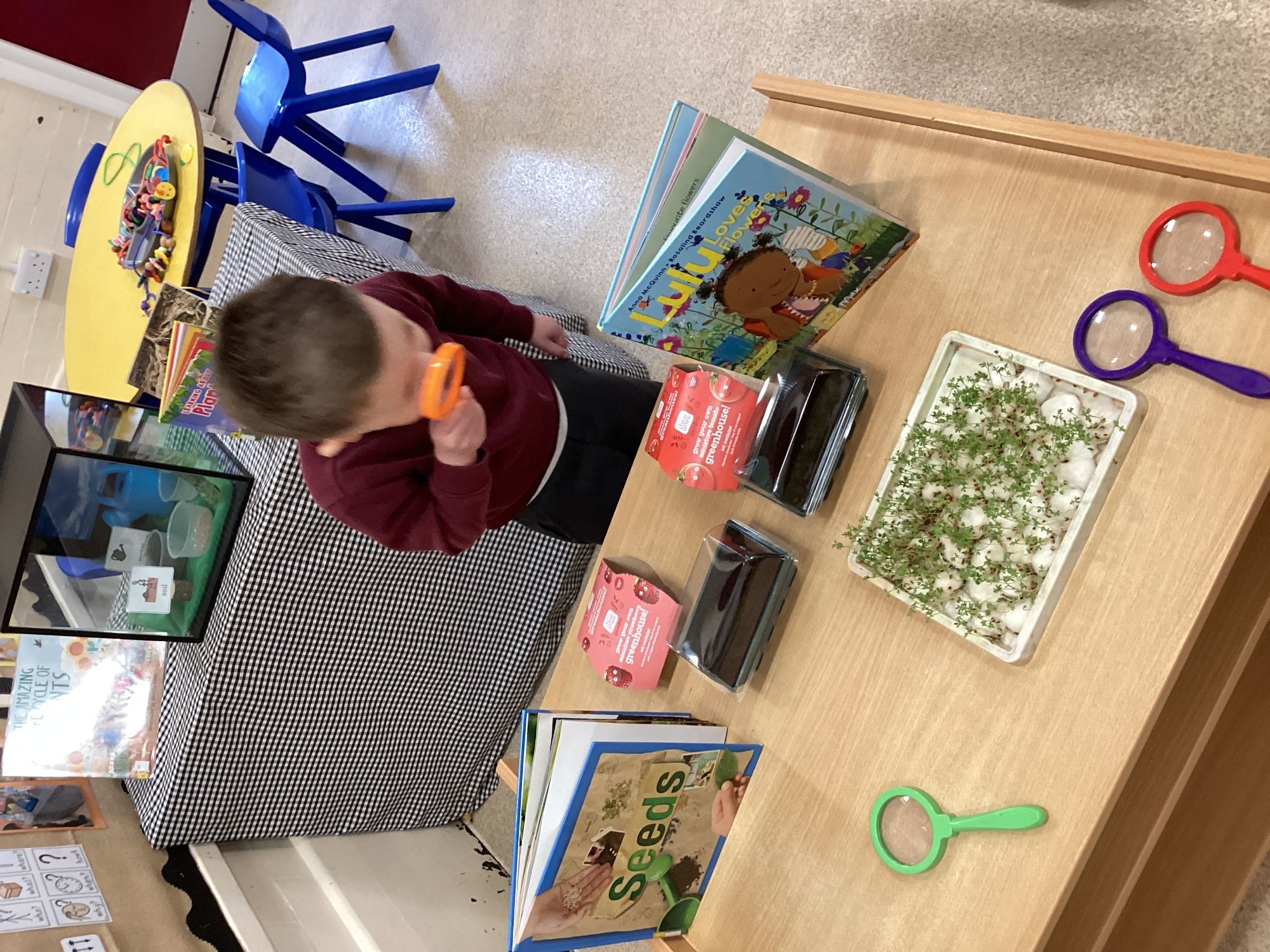 Children planted seeds and observed the stages of plant growth over time. They talked about what plants need in order to grow and described the changes they noticed as the seeds developed. Through regular observation, discussion and drawing, children developed an understanding of growth and change.