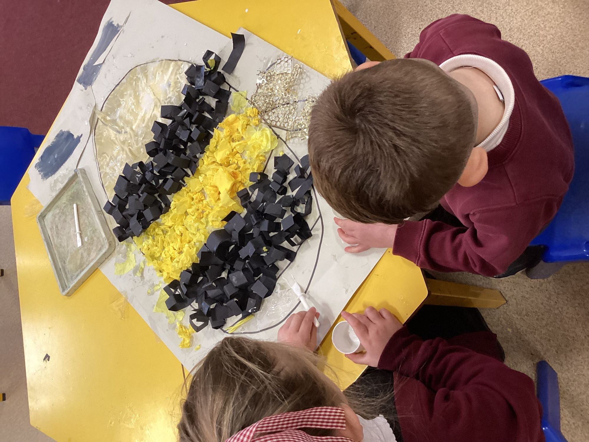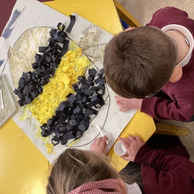 Children created a large bumblebee collage using a variety of techniques, including scrunching, twisting, folding, bending, rolling and ripping.