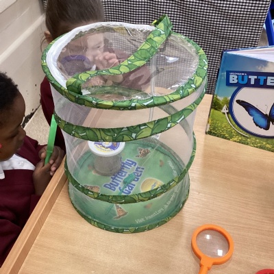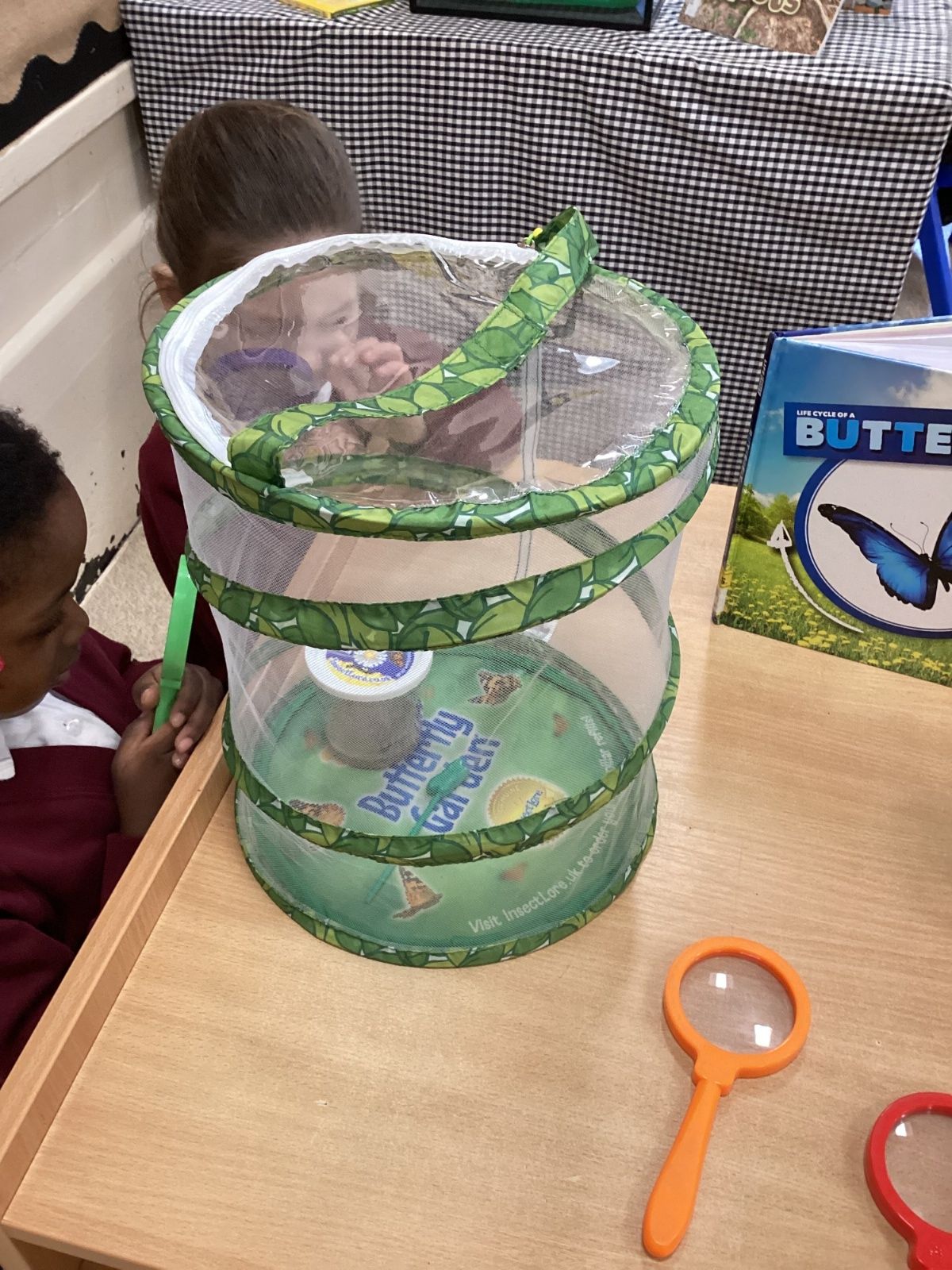 Children explored the life cycle of a butterfly by observing and discussing how living things change over time. They predicted what a caterpillar would turn into and talked about each stage using simple vocabulary. Through adult-led discussion and drawing activities, children sequenced the stages of the butterfly life cycle, developing their understanding of change over time.