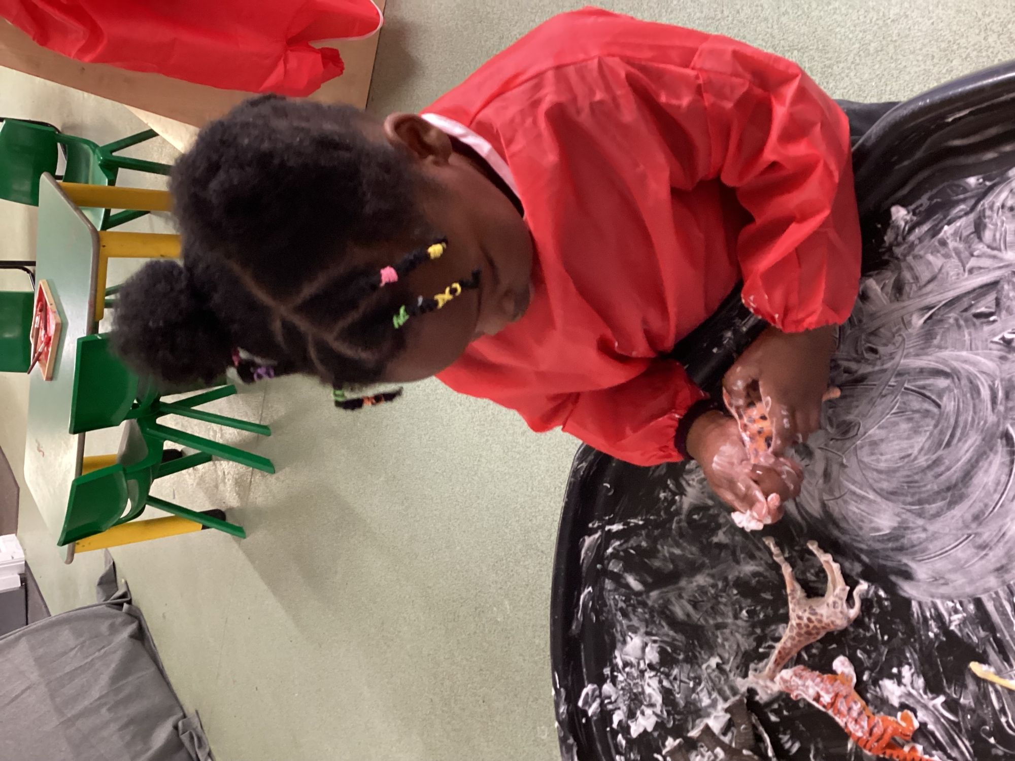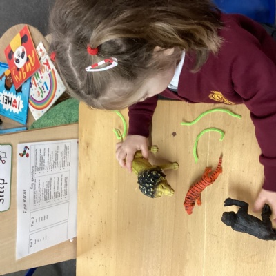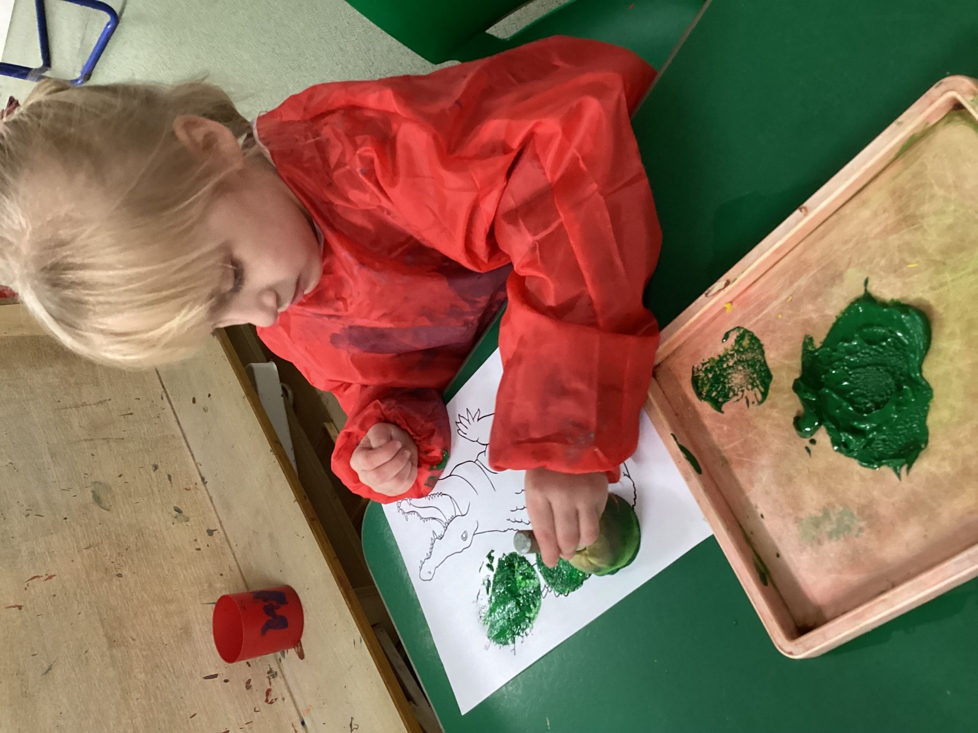 There were so many creative experiences to explore this week. Using forks to help us create a lion’s mane, sticking colourful feathers to the parrot and using circular stampers to paint crocodiles and snakes.