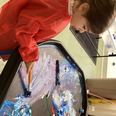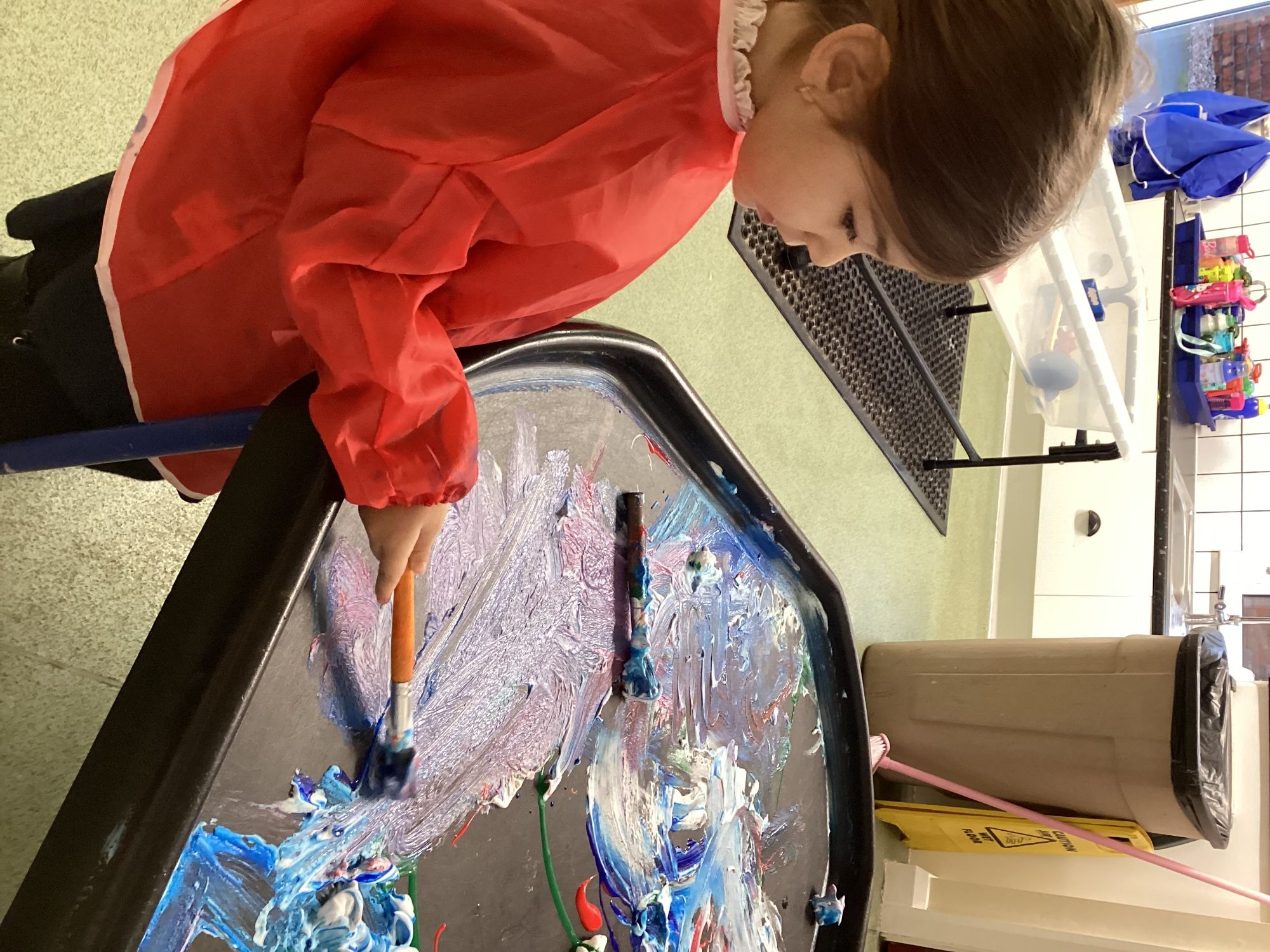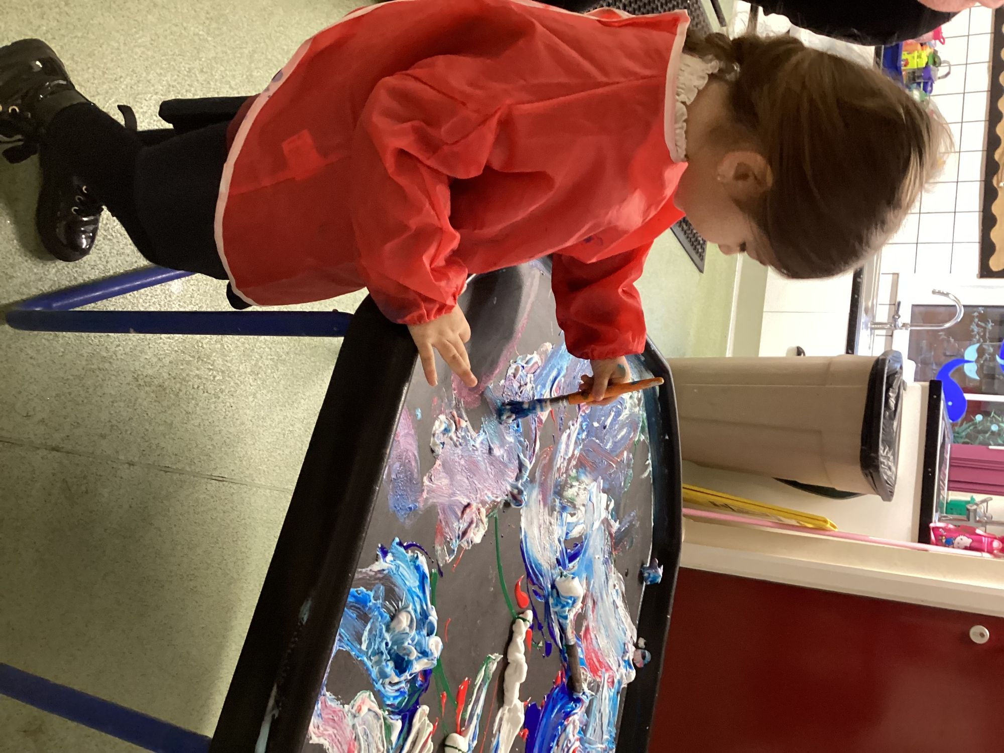 This week we have looked at different pieces of art by Jackson Pollock. We tried to create our own art using colour and shape. We create art on paper with felt tip pens, paintbrushes and pipettes. We also created art using our hands in the tuff spot with paint and shaving foam. It’s been lots of fun.