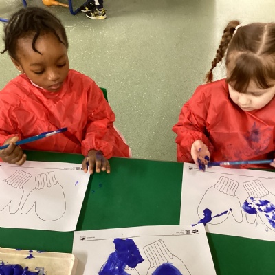 Painting our hands and making hand prints in a pair of mittens was so much fun! We also loved using new techniques to paint, we printed bricks onto an igloo shape by stamping the duplo bricks into white paint.