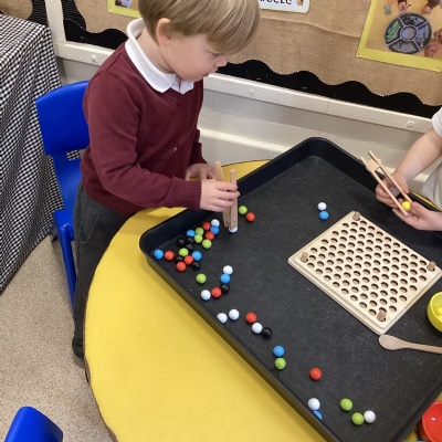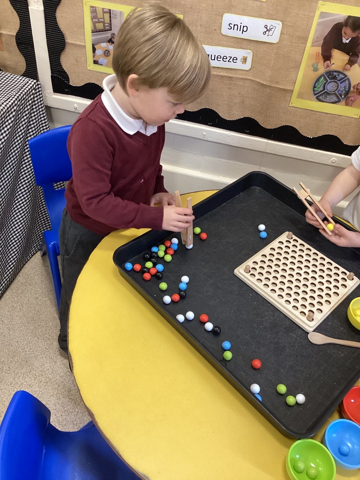 The children explored patterns and fine motor skills by placing balls onto a baseboard, using tweezers or spoons, to match different pattern cards. The children carefully looked at the pattern on the card and worked to recreate it on the board by placing the balls in the correct spaces.