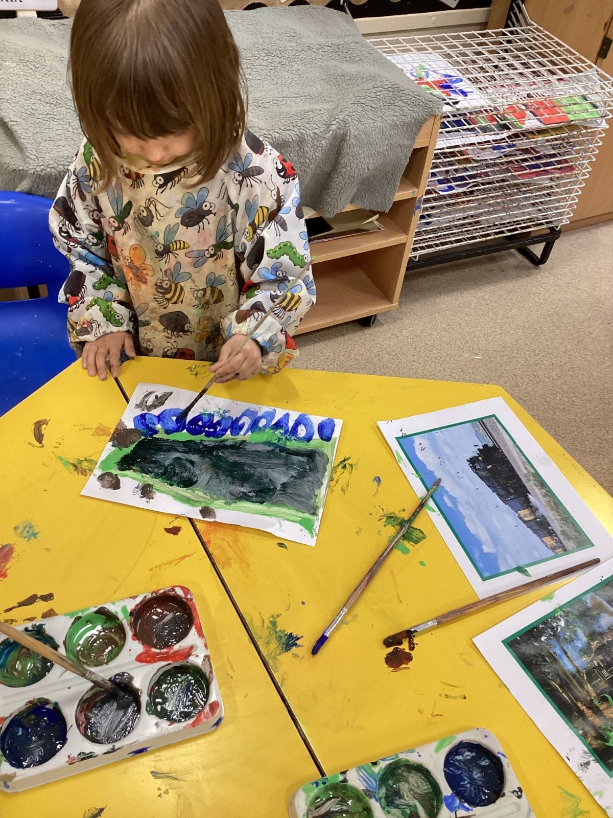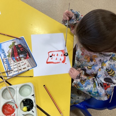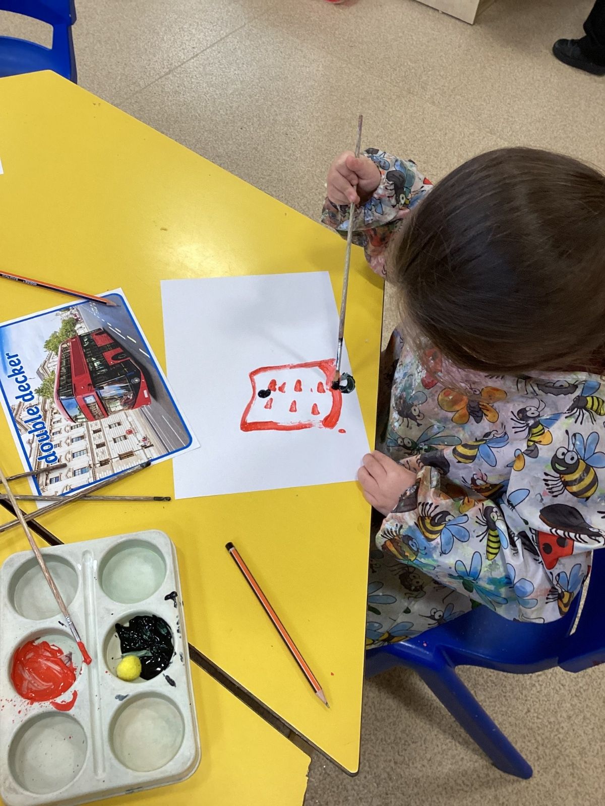 The children explored painting for a purpose by creating pictures of vehicles. Using photographs of a car, bus, plane, boat, and train as a stimulus, the children chose colours that matched each vehicle and painted their own versions.