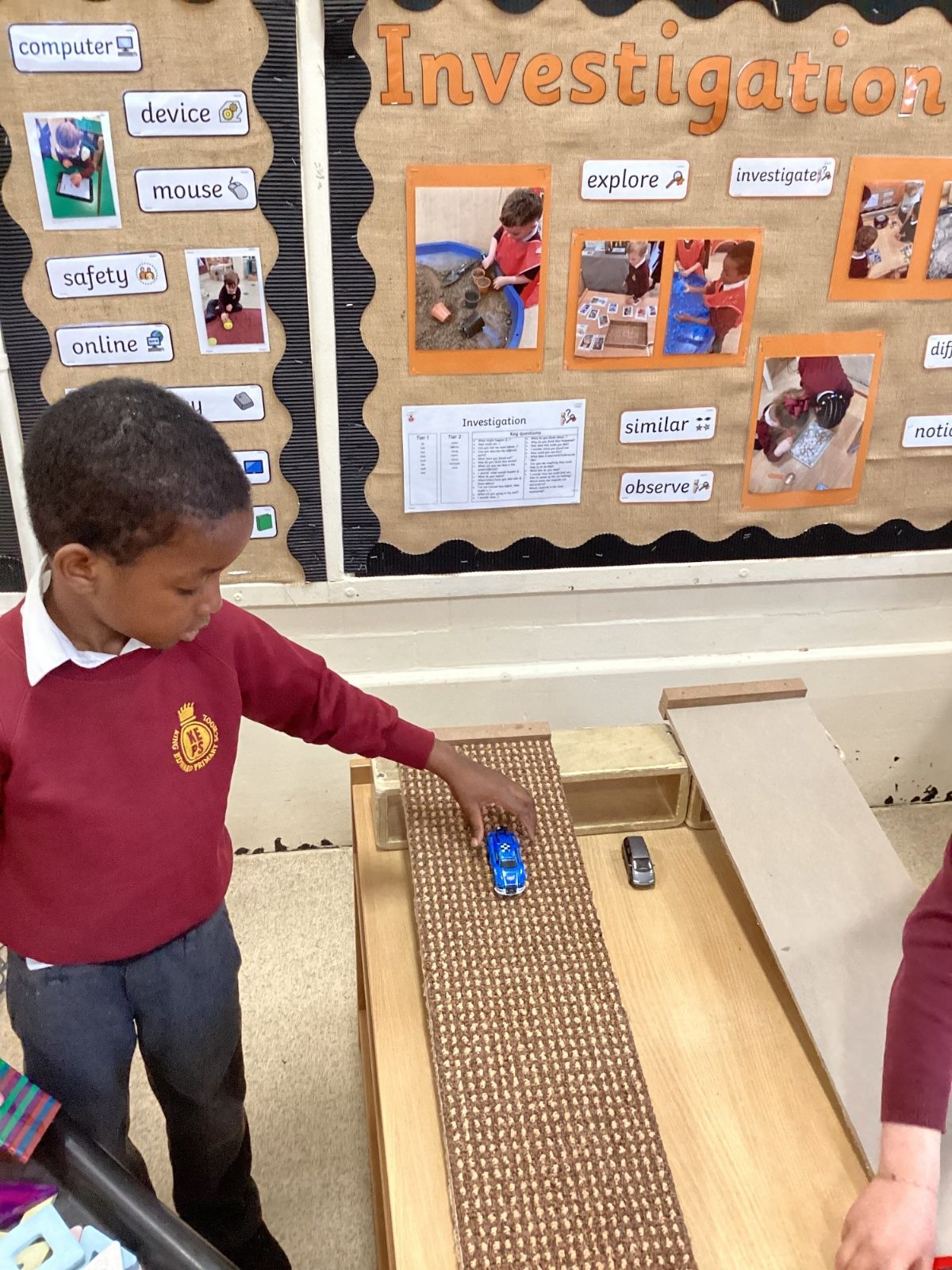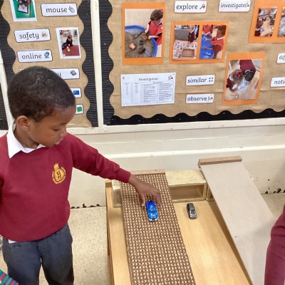 We explored how vehicles move using ramps and different toy vehicles. The children rolled cars and other vehicles down the ramp to see which one travelled the fastest and which went the furthest. We tried different surfaces on the ramps and noticed that some vehicles moved faster depending on the surface and the type of wheels they had. The children enjoyed making predictions, watching carefully, and talking about what they noticed as the vehicles moved.