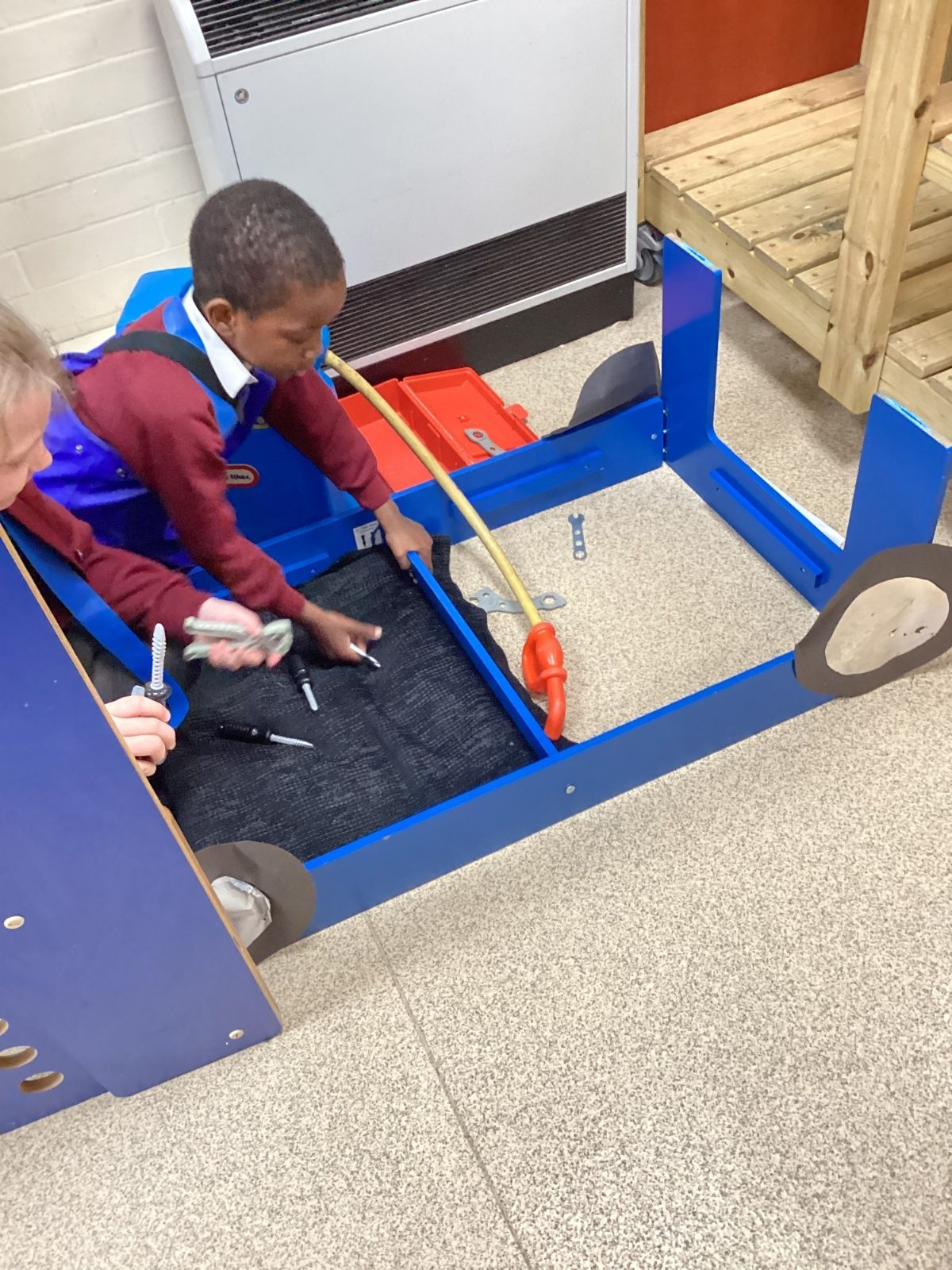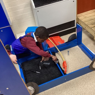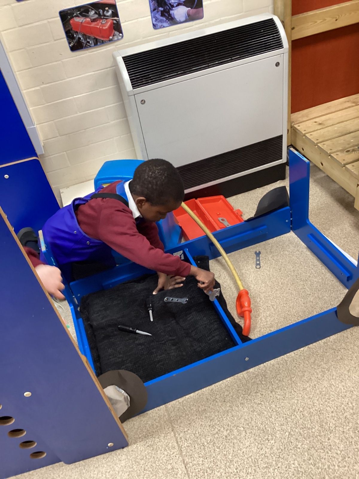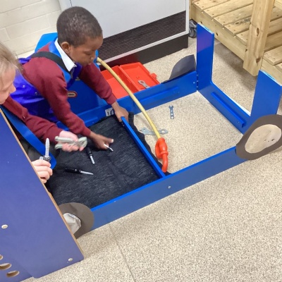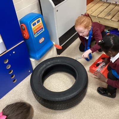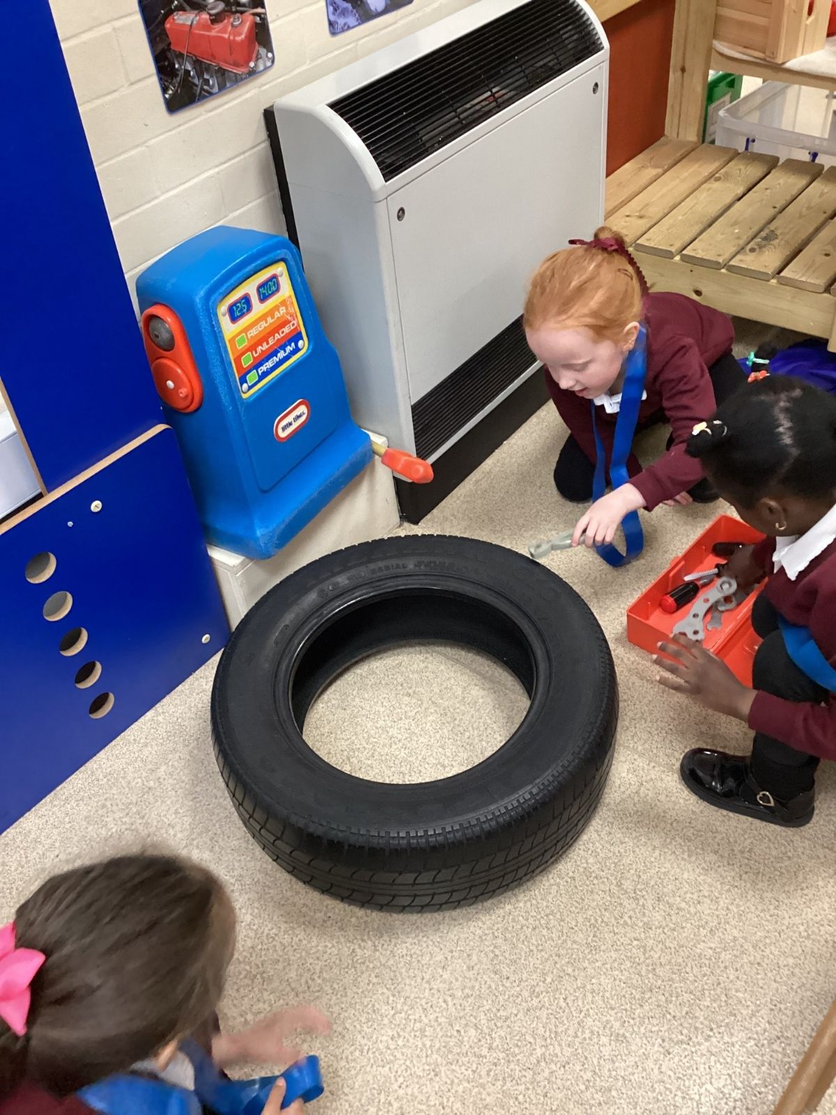 We created a garage role play area with toy cars, tools and tyres. The children explored the area and took on different roles such as mechanics and customers.